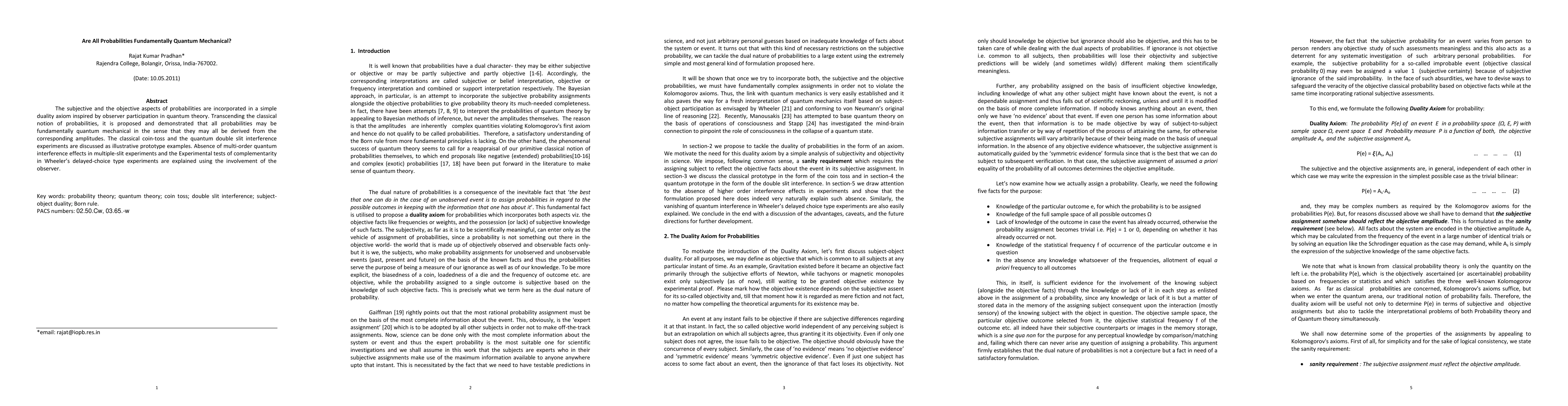 The research proposes a duality axiom to incorporate both subjective and objective aspects of probabilities, inspired by observer participation in quantum theory, demonstrating that all probabilities can be fundamentally quantum mechanical by deriving them from corresponding amplitudes.
