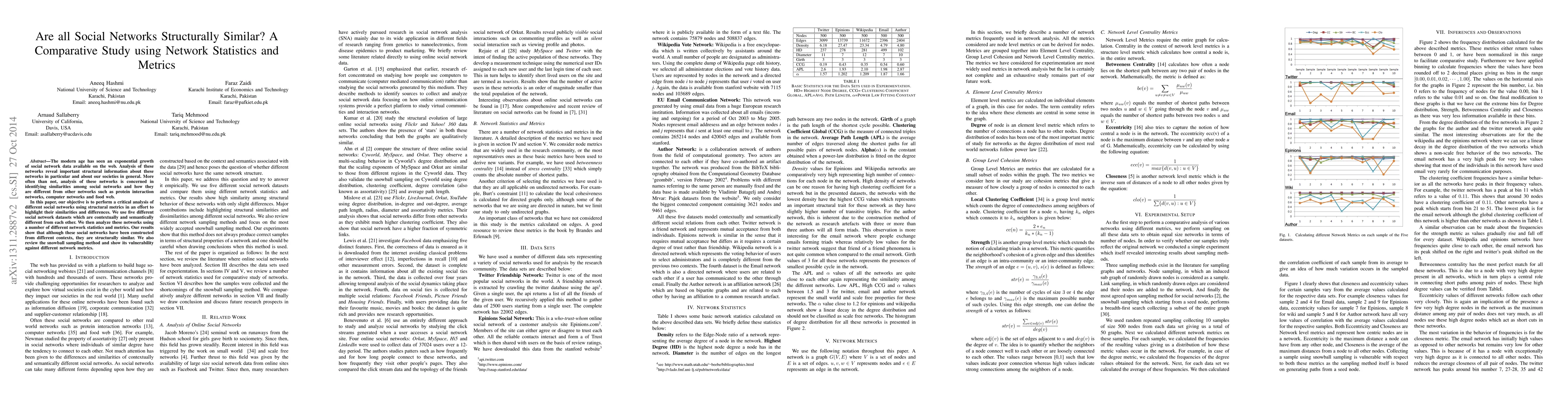 The modern age has seen an exponential growth of social network data available on the web. Analysis of these networks reveal important structural information about these networks in particular and about our societies in general. More often than not, analysis of these networks is concerned in identifying similarities among social networks and how they are different from other networks such as protein interaction networks, computer networks and food web. In this paper, our objective is to perform a critical analysis of different social networks using structural metrics in an effort to highlight their similarities and differences. We use five different social network datasets which are contextually and semantically different from each other. We then analyze these networks using a number of different network statistics and metrics. Our results show that although these social networks have been constructed from different contexts, they are structurally similar. We also review the snowball sampling method and show its vulnerability against different network metrics.