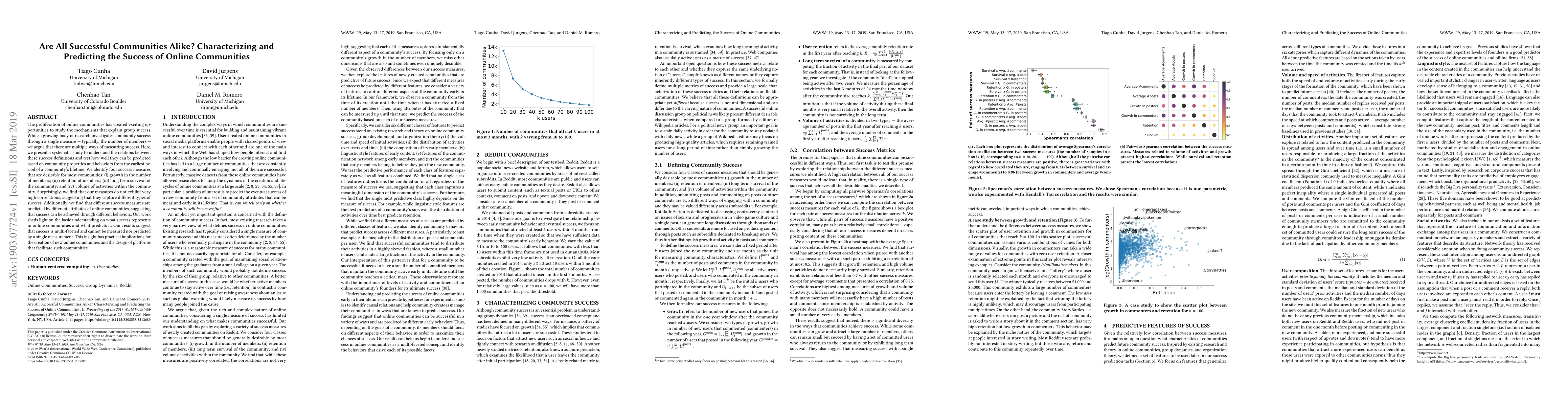 This paper explores various dimensions of success in online communities, identifying four key measures: member growth, retention, long-term survival, and activity volume. It finds that these measures do not correlate highly, indicating different types of success, and that different success metrics are predicted by distinct community attributes.