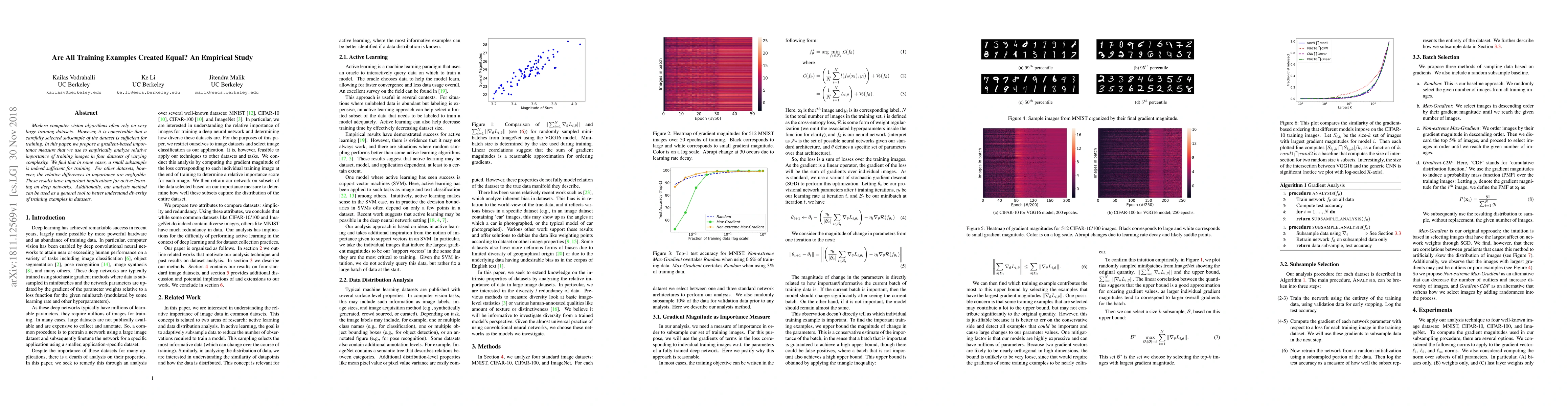 This paper proposes a gradient-based importance measure to evaluate the relative significance of training images in four datasets, finding that while some datasets benefit from a small subsample, others show negligible differences in importance, with implications for active learning on deep networks. The analysis method serves as a tool for understanding training example diversity.