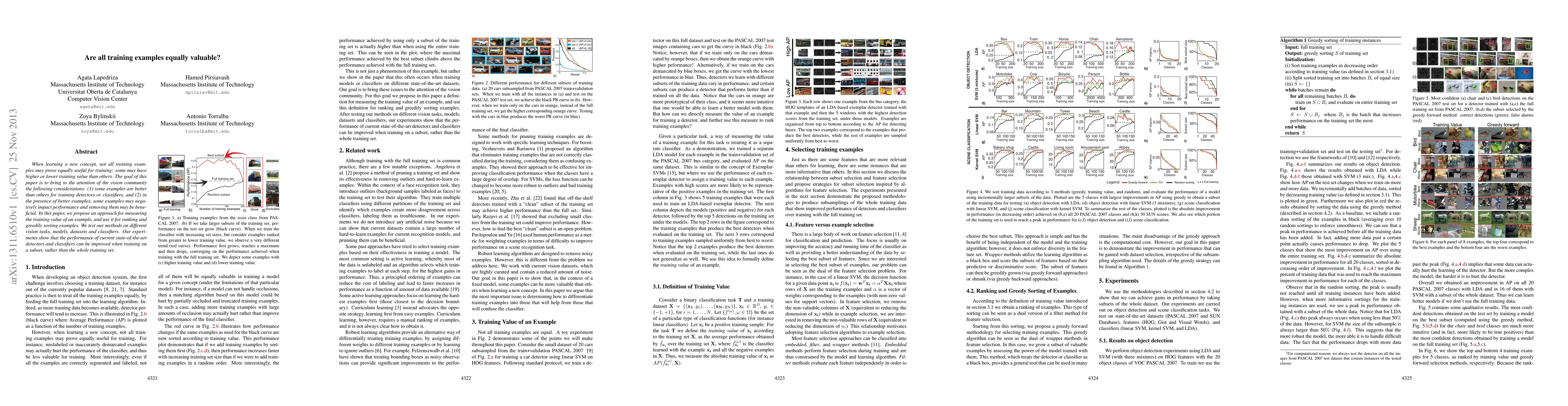 This paper proposes a method to assess the training value of individual examples, demonstrating that not all training examples are equally useful. Experiments show that focusing on high-value examples can improve the performance of detectors and classifiers, suggesting that removing less valuable examples can yield better results.