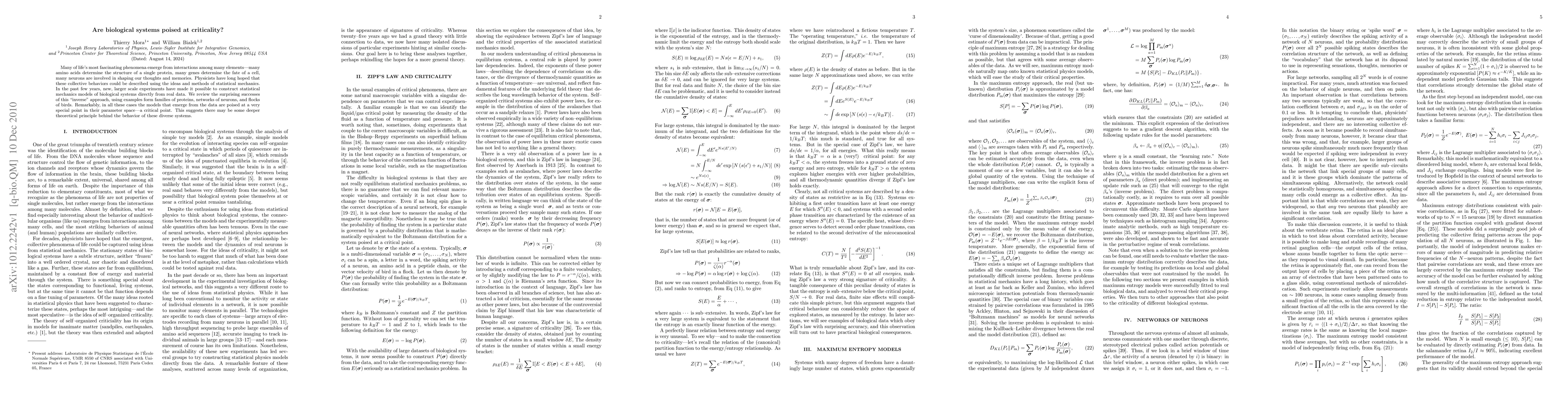 This paper reviews recent successes in applying statistical mechanics to biological systems, showing that models derived from real data often exhibit criticality. This suggests a potential underlying theoretical principle governing diverse biological phenomena.
