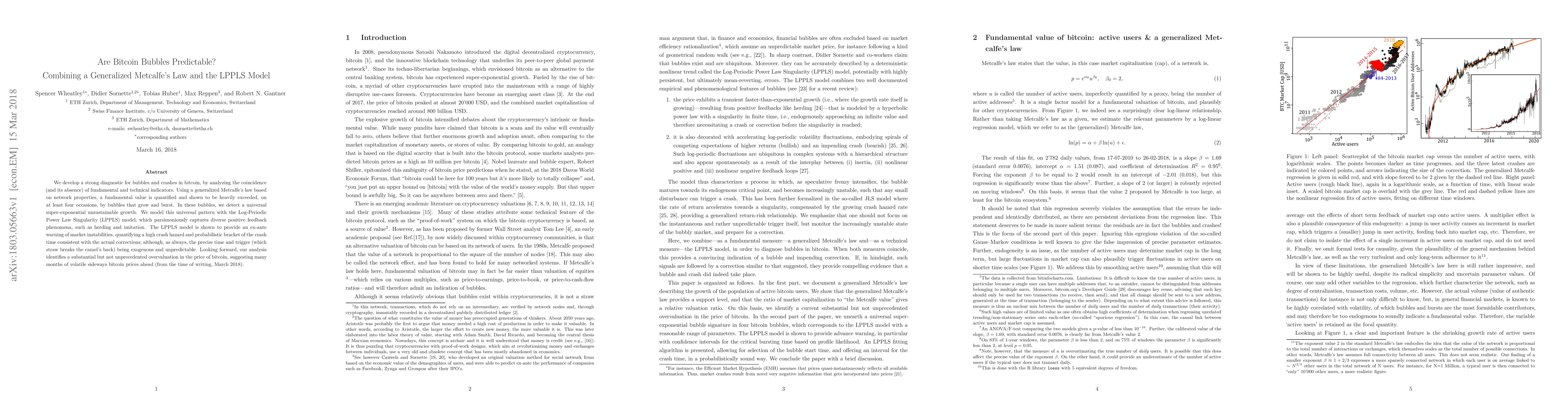 We develop a strong diagnostic for bubbles and crashes in bitcoin, by analyzing the coincidence (and its absence) of fundamental and technical indicators. Using a generalized Metcalfe's law based on network properties, a fundamental value is quantified and shown to be heavily exceeded, on at least four occasions, by bubbles that grow and burst. In these bubbles, we detect a universal super-exponential unsustainable growth. We model this universal pattern with the Log-Periodic Power Law Singularity (LPPLS) model, which parsimoniously captures diverse positive feedback phenomena, such as herding and imitation. The LPPLS model is shown to provide an ex-ante warning of market instabilities, quantifying a high crash hazard and probabilistic bracket of the crash time consistent with the actual corrections; although, as always, the precise time and trigger (which straw breaks the camel's back) being exogenous and unpredictable. Looking forward, our analysis identifies a substantial but not unprecedented overvaluation in the price of bitcoin, suggesting many months of volatile sideways bitcoin prices ahead (from the time of writing, March 2018).