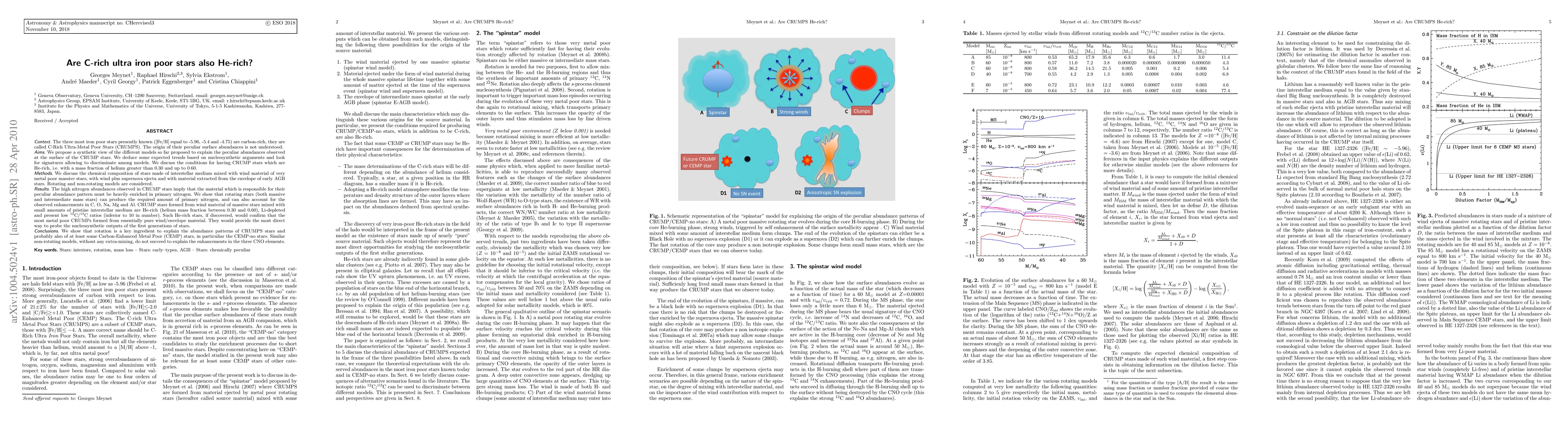 (abridged) The three most iron poor stars presently known ([Fe/H] equal to -5.96, -5.4 and -4.75) are carbon-rich, they are called C-Rich Ultra-Metal Poor Stars (CRUMPS). The origin of their peculiar surface abundances is not understood. We propose a synthetic view of the different models so far proposed to explain the peculiar abundances observed at the surface of the CRUMP stars. We deduce some expected trends based on nucleosynthetic arguments and look for signatures allowing to discriminate among models. We discuss the conditions for having CRUMP stars which are He-rich, i.e. with a mass fraction of helium greater than 0.30 and up to 0.60. We discuss the chemical composition of stars made of interstellar medium mixed with wind material of very metal poor massive stars, with wind plus supernova ejecta and with material extracted from the envelope of early AGB stars. Rotating and non-rotating models are considered. CRUMP stars formed from wind material of massive stars mixed with small amounts of pristine interstellar medium are He-rich (helium mass fraction between 0.30 and 0.60), Li-depleted and present low $^{12}$C/$^{13}$C ratios (inferior to 10 in number). Such He-rich stars, if discovered, would confirm that the most metal poor CRUMPs formed from essentially pure wind/envelope material. They would provide the most direct way to probe the nucleosynthetic outputs of the first generations of stars. We show that rotation is a key ingredient to explain the abundance patterns of CRUMPS stars.