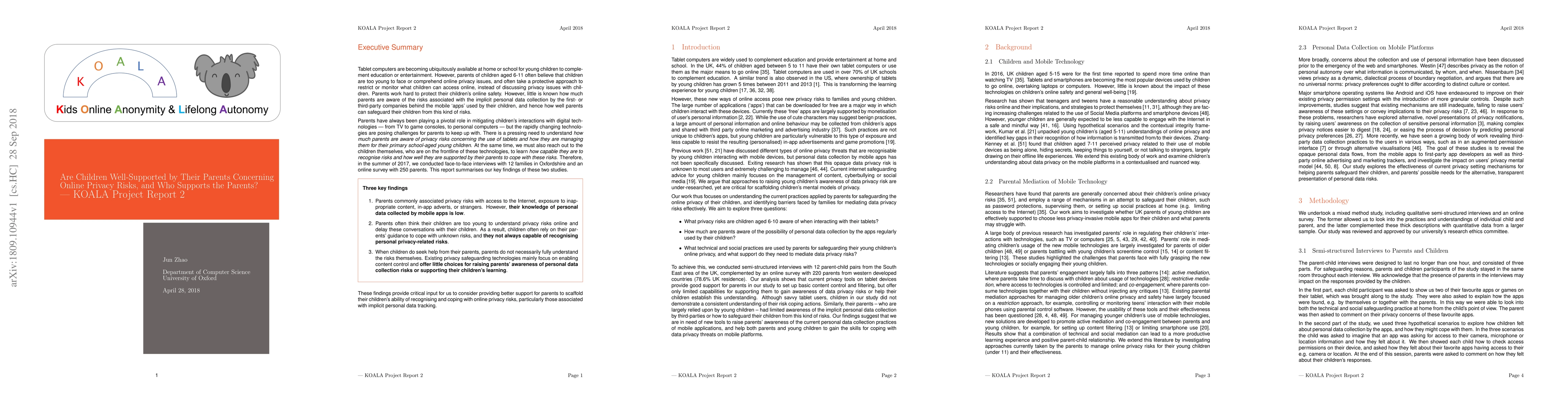 Tablet computers are becoming ubiquitously available at home or school for young children to complement education or entertainment. However, parents of children aged 6-11 often believe that children are too young to face or comprehend online privacy issues, and often take a protective approach to restrict or monitor what children can access online, instead of discussing privacy issues with children. Parents work hard to protect their children's online safety. However, little is known how much parents are aware of the risks associated with the implicit personal data collection by the first- or third-party companies behind the mobile `apps' used by their children, and hence how well parents can safeguard their children from this kind of risks. Parents have always been playing a pivotal role in mitigating children's interactions with digital technologies --- from TV to game consoles, to personal computers --- but the rapidly changing technologies are posing challenges for parents to keep up with. There is a pressing need to understand how much parents are aware of privacy risks concerning the use of tablets and how they are managing them for their primary school-aged young children. At the same time, we must also reach out to the children themselves, who are on the frontline of these technologies, to learn how capable they are to recognise risks and how well they are supported by their parents to cope with these risks. Therefore, in the summer of 2017, we conducted face-to-face interviews with 12 families in Oxfordshire and an online survey with 250 parents. This report summarises our key findings of these two studies.
