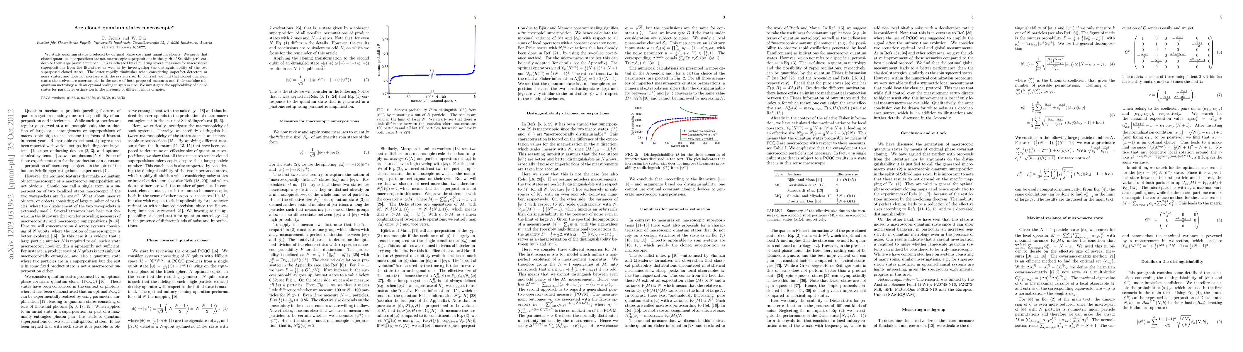 This paper explores the nature of cloned quantum states produced by optimal phase covariant quantum cloners, arguing that while these states are macroscopic in terms of quantum metrology, they do not exhibit the macroscopic superpositions akin to Schrödinger's cat. The study finds that the distinguishability of cloned states diminishes with noise and does not increase with system size.