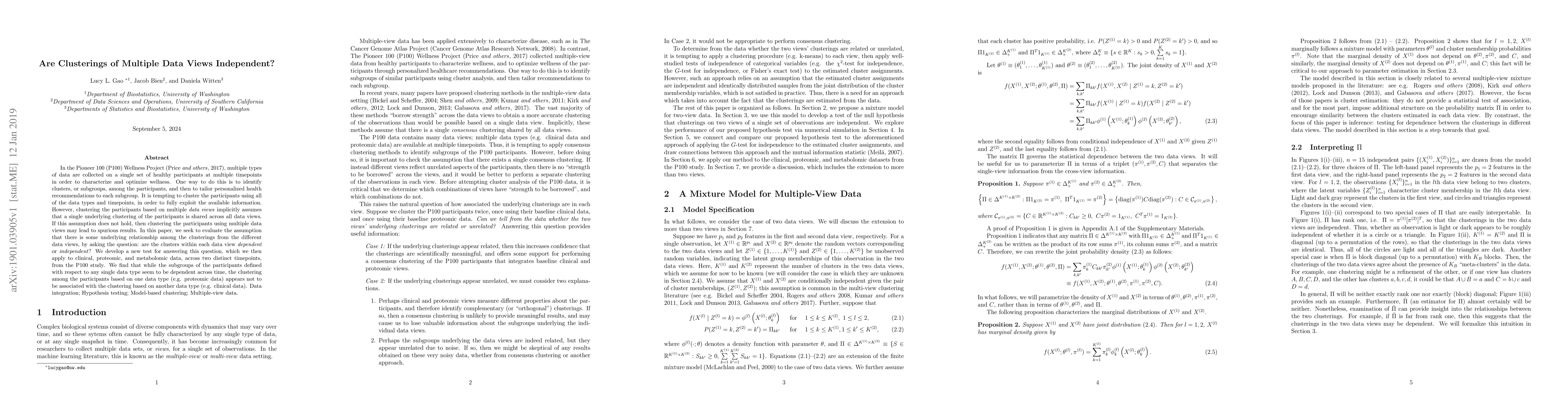 In the Pioneer 100 (P100) Wellness Project (Price and others, 2017), multiple types of data are collected on a single set of healthy participants at multiple timepoints in order to characterize and optimize wellness. One way to do this is to identify clusters, or subgroups, among the participants, and then to tailor personalized health recommendations to each subgroup. It is tempting to cluster the participants using all of the data types and timepoints, in order to fully exploit the available information. However, clustering the participants based on multiple data views implicitly assumes that a single underlying clustering of the participants is shared across all data views. If this assumption does not hold, then clustering the participants using multiple data views may lead to spurious results. In this paper, we seek to evaluate the assumption that there is some underlying relationship among the clusterings from the different data views, by asking the question: are the clusters within each data view dependent or independent? We develop a new test for answering this question, which we then apply to clinical, proteomic, and metabolomic data, across two distinct timepoints, from the P100 study. We find that while the subgroups of the participants defined with respect to any single data type seem to be dependent across time, the clustering among the participants based on one data type (e.g. proteomic data) appears not to be associated with the clustering based on another data type (e.g. clinical data).