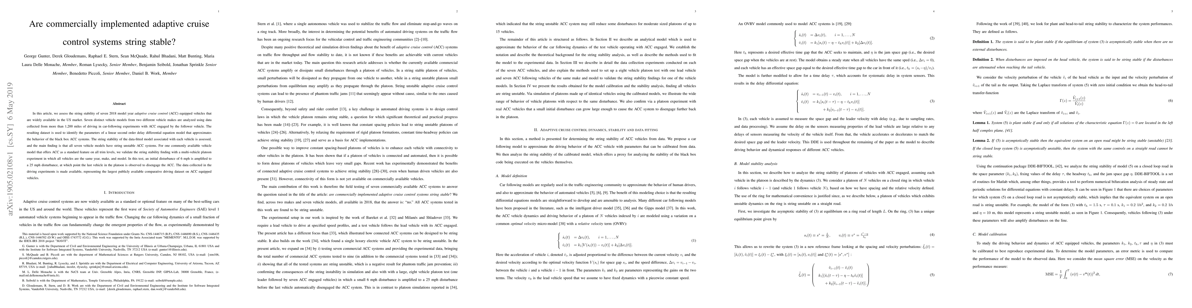 In this article, we assess the string stability of seven 2018 model year adaptive cruise control (ACC) equipped vehicles that are widely available in the US market. Seven distinct vehicle models from two different vehicle makes are analyzed using data collected from more than 1,200 miles of driving in car-following experiments with ACC engaged by the follower vehicle. The resulting dataset is used to identify the parameters of a linear second order delay differential equation model that approximates the behavior of the black box ACC systems. The string stability of the data-fitted model associated with each vehicle is assessed, and the main finding is that all seven vehicle models have string unstable ACC systems. For one commonly available vehicle model that offers ACC as a standard feature on all trim levels, we validate the string stability finding with a multi-vehicle platoon experiment in which all vehicles are the same year, make, and model. In this test, an initial disturbance of 6 mph is amplified to a 25 mph disturbance, at which point the last vehicle in the platoon is observed to disengage the ACC. The data collected in the driving experiments is made available, representing the largest publicly available comparative driving dataset on ACC equipped vehicles.