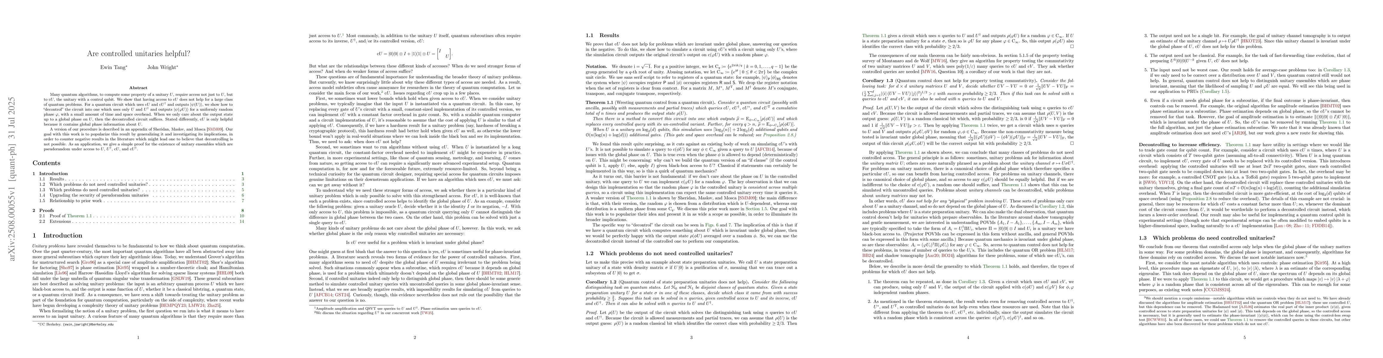 This paper demonstrates that controlled unitaries ($cU$) do not significantly aid in solving a broad range of quantum computational problems. By decontrolling circuits that use $cU$ and $cU^dagger$, the authors show these can be transformed into circuits using only $U$ and $U^dagger$, outputting a state up to a global phase. This reveals that the perceived utility of $cU$ is mainly due to the phase information it carries about $U$. The method generalizes previous work and has implications for proving the existence of pseudorandom unitary ensembles under varied access patterns.