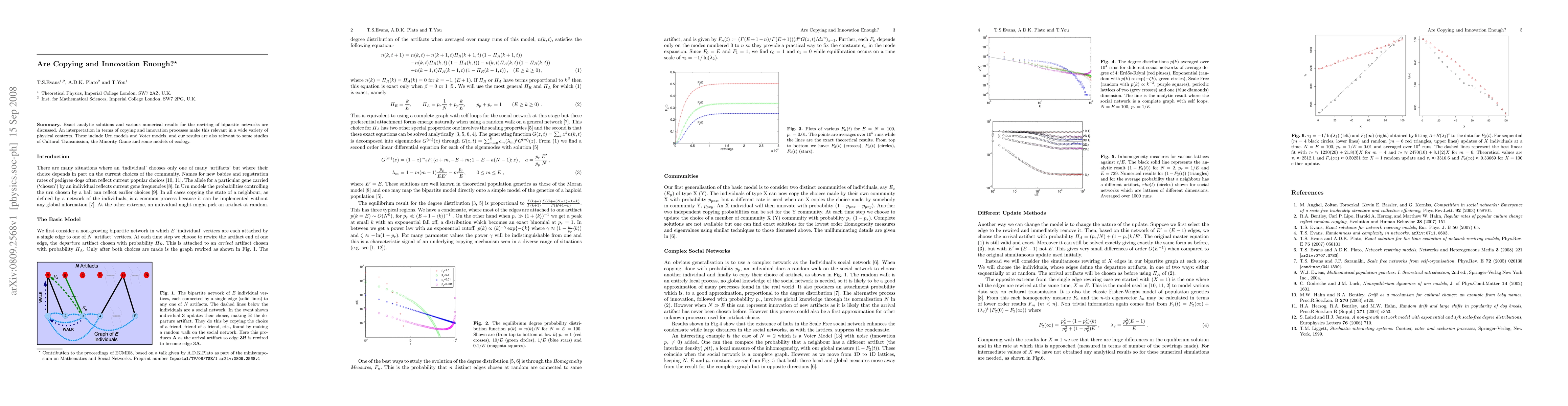 Exact analytic solutions and various numerical results for the rewiring of bipartite networks are discussed. An interpretation in terms of copying and innovation processes make this relevant in a wide variety of physical contexts. These include Urn models and Voter models, and our results are also relevant to some studies of Cultural Transmission, the Minority Game and some models of ecology.