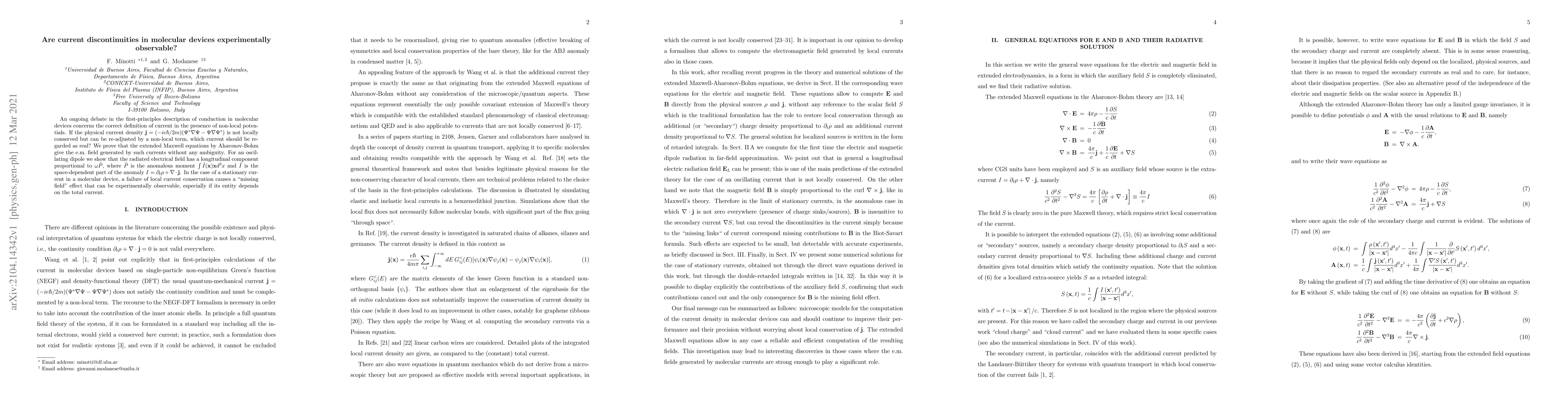 An ongoing debate in the first-principles description of conduction in molecular devices concerns the correct definition of current in the presence of non-local potentials. If the physical current density ${\bf j}=(-ie\hbar/2m)(\Psi^* \nabla \Psi- \Psi \nabla \Psi^*)$ is not locally conserved but can be re-adjusted by a non-local term, which current should be regarded as real? We prove that the extended Maxwell equations by Aharonov-Bohm give the e.m.\ field generated by such currents without any ambiguity. For an oscillating dipole we show that the radiated electrical field has a longitudinal component proportional to $ \omega \hat{P}$, where $\hat{P}$ is the anomalous moment $\int \hat{I}(\mathbf{x})\mathbf{x} d^3x$ and $\hat{I}$ is the space-dependent part of the anomaly $I=\partial_t \rho+\nabla \cdot \mathbf{j}$. In the case of a stationary current in a molecular device, a failure of local current conservation causes a "missing field" effect that can be experimentally observable, especially if its entity depends on the total current.