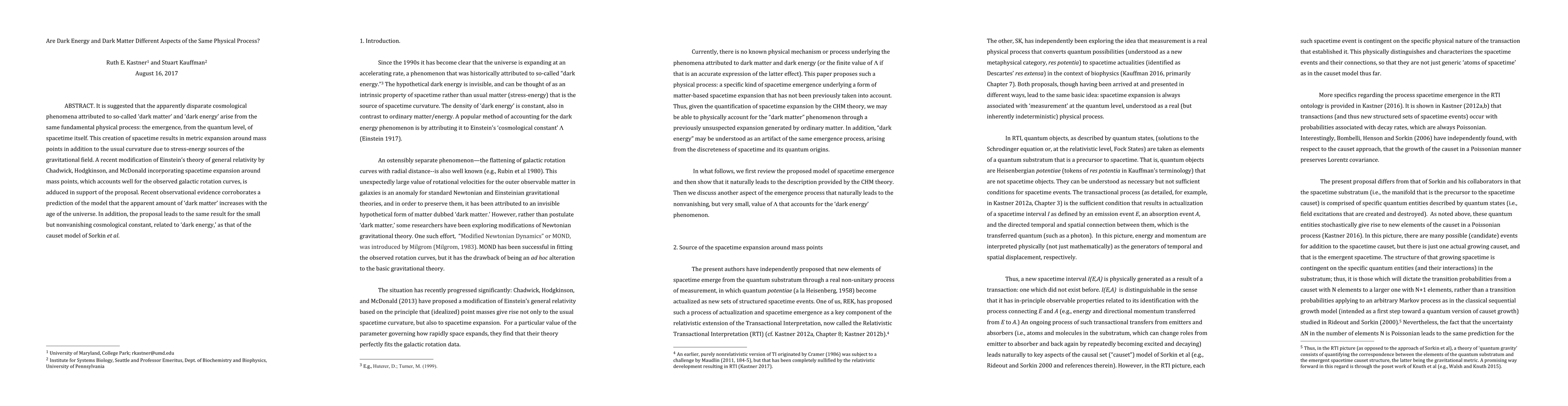Researchers suggest dark matter and dark energy may be aspects of the same physical process, related to spacetime emergence from quantum mechanics.
