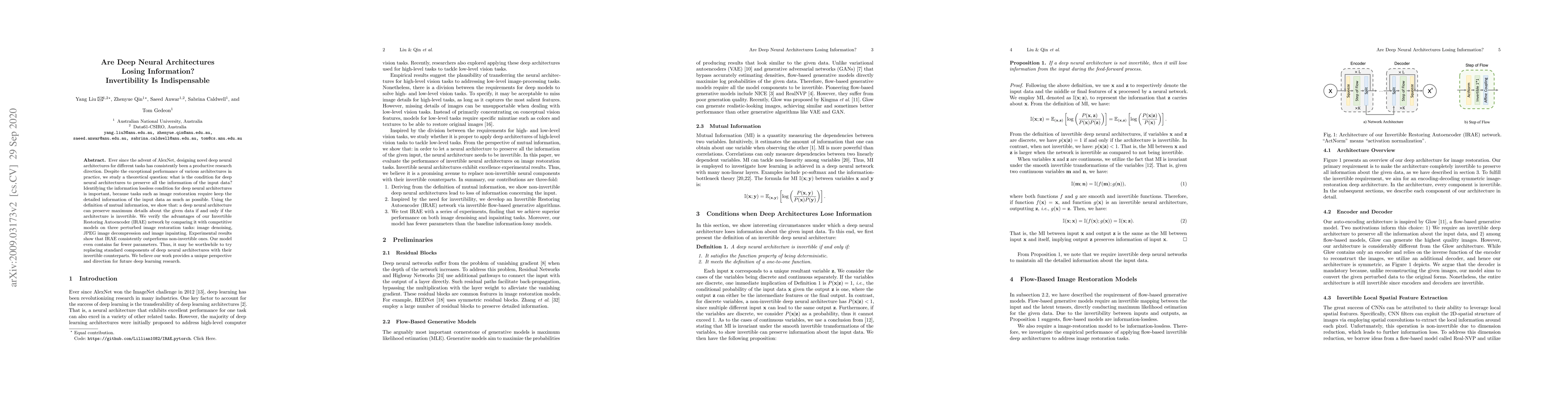 Ever since the advent of AlexNet, designing novel deep neural architectures for different tasks has consistently been a productive research direction. Despite the exceptional performance of various architectures in practice, we study a theoretical question: what is the condition for deep neural architectures to preserve all the information of the input data? Identifying the information lossless condition for deep neural architectures is important, because tasks such as image restoration require keep the detailed information of the input data as much as possible. Using the definition of mutual information, we show that: a deep neural architecture can preserve maximum details about the given data if and only if the architecture is invertible. We verify the advantages of our Invertible Restoring Autoencoder (IRAE) network by comparing it with competitive models on three perturbed image restoration tasks: image denoising, jpeg image decompression and image inpainting. Experimental results show that IRAE consistently outperforms non-invertible ones. Our model even contains far fewer parameters. Thus, it may be worthwhile to try replacing standard components of deep neural architectures, such as residual blocks and ReLU, with their invertible counterparts. We believe our work provides a unique perspective and direction for future deep learning research.