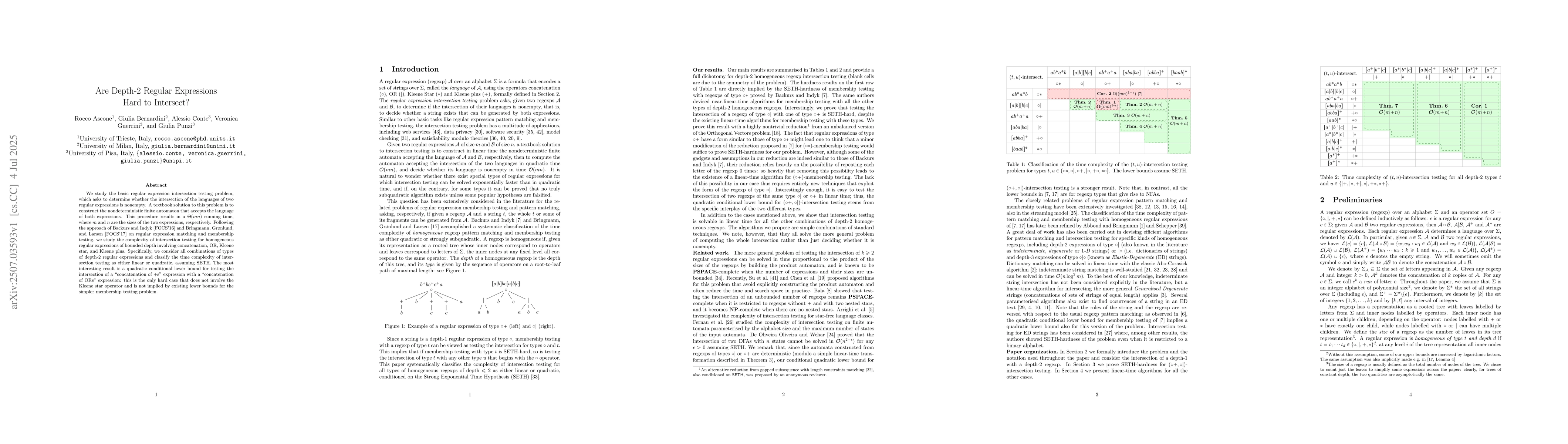We study the basic regular expression intersection testing problem, which asks to determine whether the intersection of the languages of two regular expressions is nonempty. A textbook solution to this problem is to construct the nondeterministic finite automaton that accepts the language of both expressions. This procedure results in a $\Theta(mn)$ running time, where $m$ and $n$ are the sizes of the two expressions, respectively. Following the approach of Backurs and Indyk [FOCS'16] and Bringmann, Gr{\o}nlund, and Larsen [FOCS'17] on regular expression matching and membership testing, we study the complexity of intersection testing for homogeneous regular expressions of bounded depth involving concatenation, OR, Kleene star, and Kleene plus. Specifically, we consider all combinations of types of depth-2 regular expressions and classify the time complexity of intersection testing as either linear or quadratic, assuming SETH. The most interesting result is a quadratic conditional lower bound for testing the intersection of a ''concatenation of +s'' expression with a ''concatenation of ORs'' expression: this is the only hard case that does not involve the Kleene star operator and is not implied by existing lower bounds for the simpler membership testing problem.