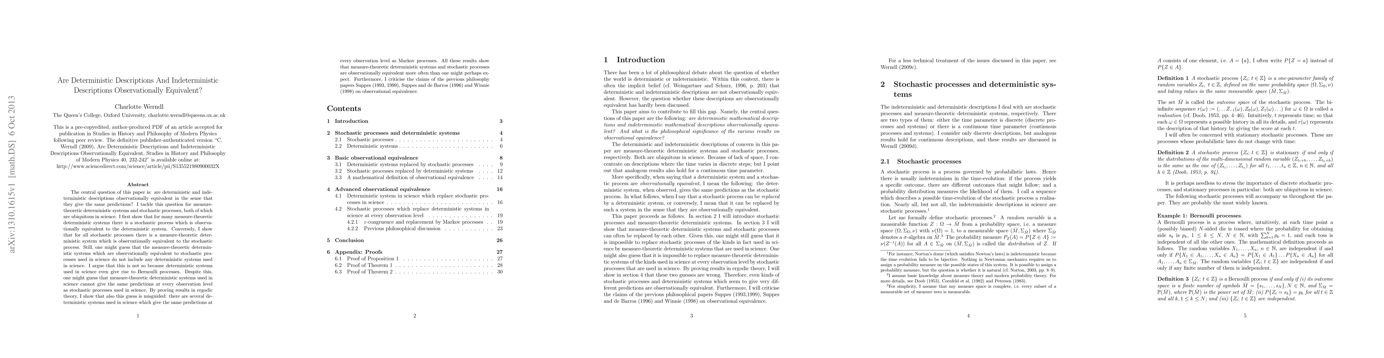 The central question of this paper is: are deterministic and indeterministic descriptions observationally equivalent in the sense that they give the same predictions? I tackle this question for measure-theoretic deterministic systems and stochastic processes, both of which are ubiquitous in science. I first show that for many measure-theoretic deterministic systems there is a stochastic process which is observationally equivalent to the deterministic system. Conversely, I show that for all stochastic processes there is a measure-theoretic deterministic system which is observationally equivalent to the stochastic process. Still, one might guess that the measure-theoretic deterministic systems which are observationally equivalent to stochastic processes used in science do not include any deterministic systems used in science. I argue that this is not so because deterministic systems used in science even give rise to Bernoulli processes. Despite this, one might guess that measure-theoretic deterministic systems used in science cannot give the same predictions at every observation level as stochastic processes used in science. By proving results in ergodic theory, I show that also this guess is misguided: there are several deterministic systems used in science which give the same predictions at every observation level as Markov processes. All these results show that measure-theoretic deterministic systems and stochastic processes are observationally equivalent more often than one might perhaps expect. Furthermore, I criticise the claims of the previous philosophy papers Suppes (1993, 1999), Suppes and de Barros (1996) and Winnie (1998) on observational equivalence.