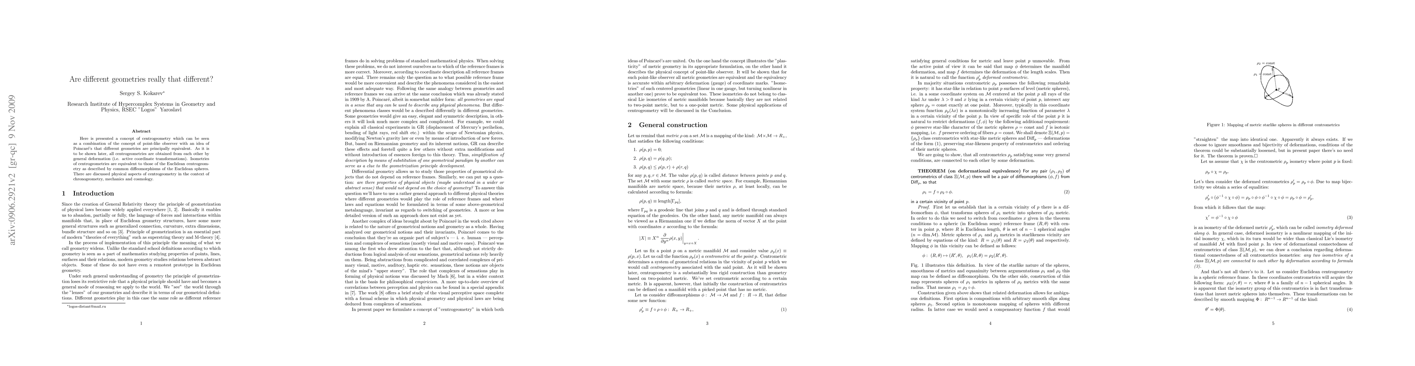 This paper explores a concept called centrogeometry, which proposes that different geometries are equivalent through general deformations and isometries. It discusses physical implications in chronogeometry, mechanics, and cosmology.