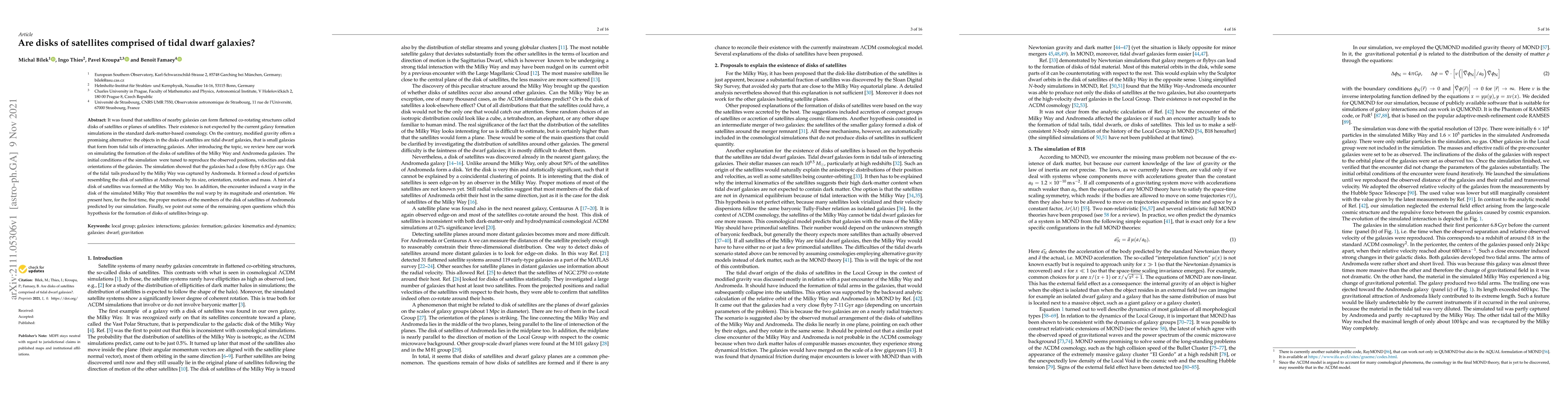 This paper investigates whether disks of satellites around nearby galaxies are tidal dwarf galaxies formed from tidal tails. The simulation of Milky Way and Andromeda galaxies shows that a close flyby 6.8 Gyr ago led to the formation of a disk of satellites resembling the observed structures, suggesting tidal dwarf galaxies as their origin.