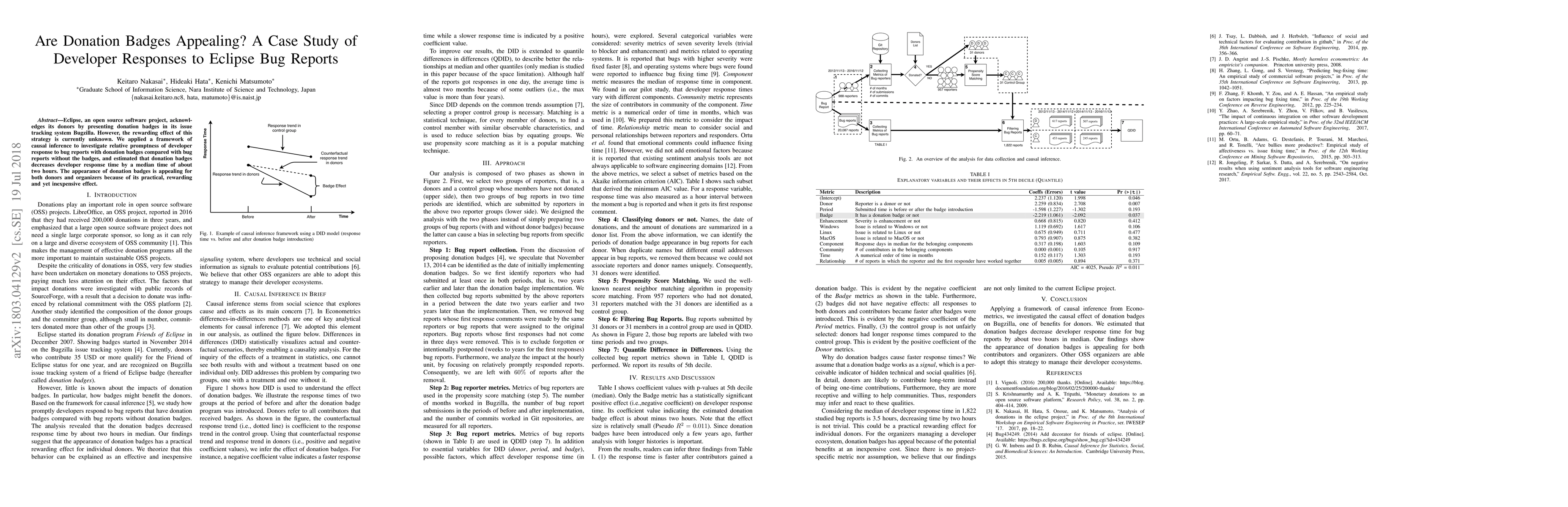 This study investigates the impact of donation badges on developer response times in Eclipse's Bugzilla system, finding that badges decrease response time by about two hours on average. The badges are deemed appealing due to their rewarding and cost-effective nature for both donors and project organizers.