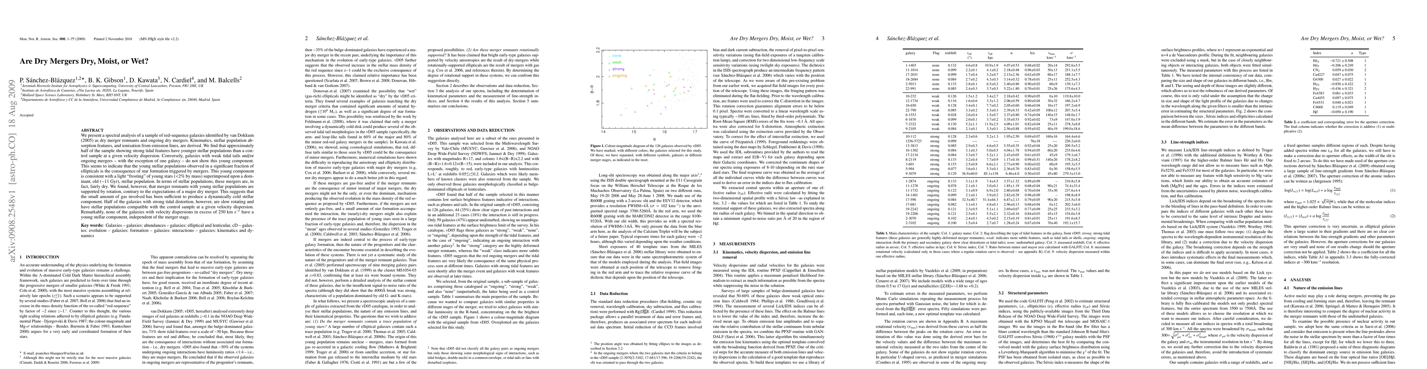 The study presents a spectral analysis of red-sequence galaxies identified as dry merger remnants and ongoing dry mergers, deriving kinematics, stellar population absorption features, and ionization from emission lines.