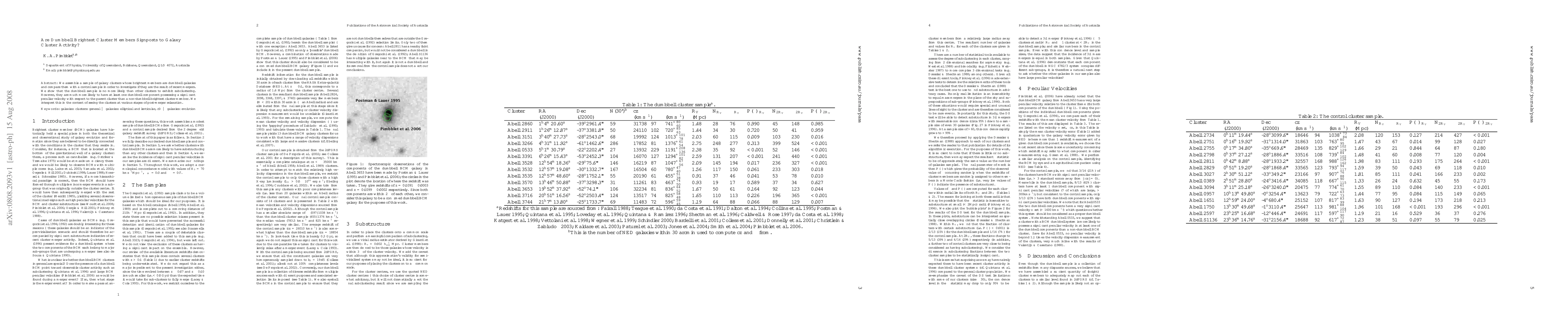 We assemble a sample of galaxy clusters whose brightest members are dumbbell galaxies and compare them with a control sample in order to investigate if they are the result of recent mergers. We show that the dumbbell sample is no more likely than other clusters to exhibit subclustering. However, they are much more likely to have at least one dumbbell component possessing a significant peculiar velocity with respect to the parent cluster than a non-dumbbell brightest cluster member. We interpret this in the context of seeing the clusters at various stages of post-merger relaxation.
