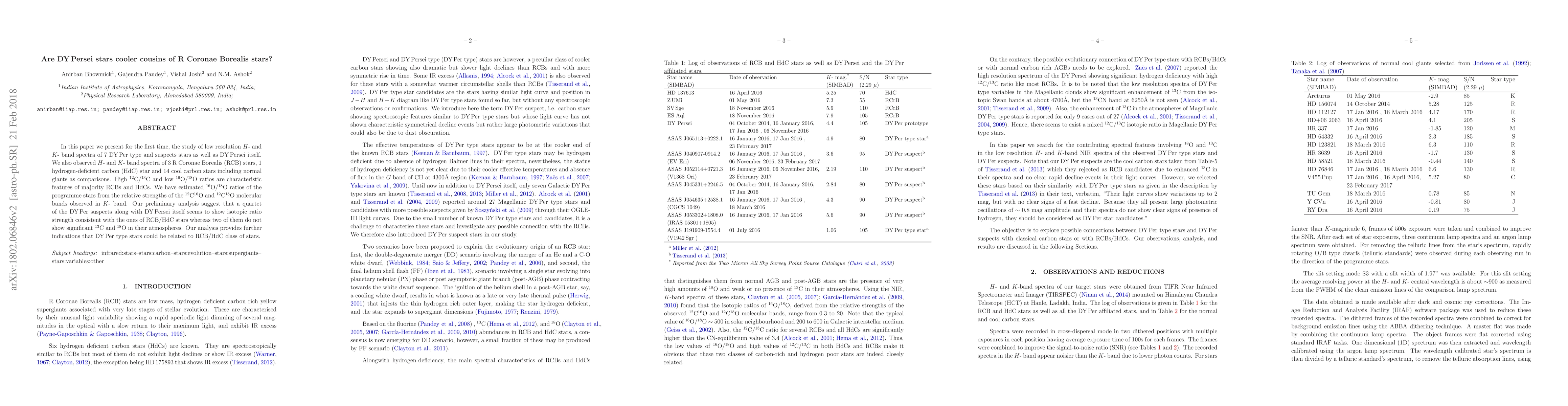 This paper investigates the spectral characteristics of DY Persei stars and compares them to R Coronae Borealis (RCB) stars, finding that four DY Persei suspects and DY Persei itself exhibit isotopic ratios similar to RCB/hydrogen-deficient carbon stars, suggesting a potential evolutionary relationship. Two DY Persei stars do not show these ratios, indicating diversity within the group.