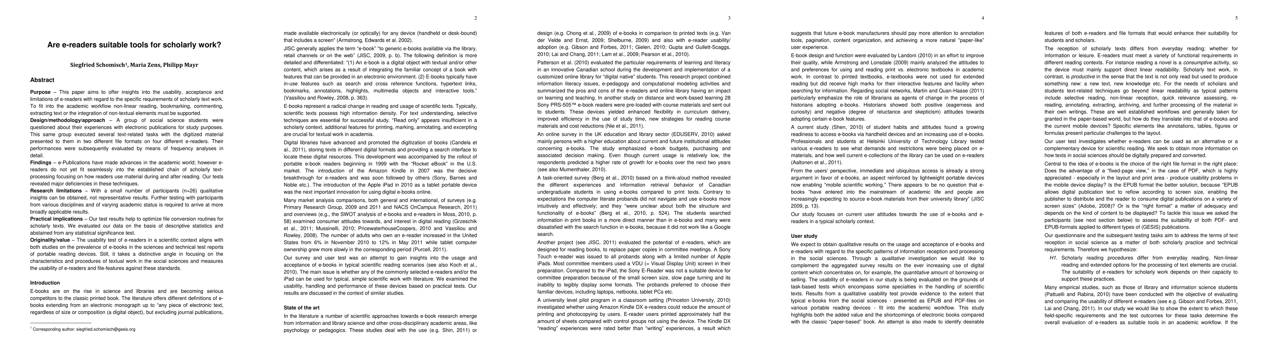 This paper aims to offer insights into the usability, acceptance and limitations of e-readers with regard to the specific requirements of scholarly text work. To fit into the academic workflow non-linear reading, bookmarking, commenting, extracting text or the integration of non-textual elements must be supported. A group of social science students were questioned about their experiences with electronic publications for study purposes. This same group executed several text-related tasks with the digitized material presented to them in two different file formats on four different e-readers. Their performances were subsequently evaluated by means of frequency analyses in detail. Findings - e-Publications have made advances in the academic world; however e-readers do not yet fit seamlessly into the established chain of scholarly text-processing focusing on how readers use material during and after reading. Our tests revealed major deficiencies in these techniques. With a small number of participants (n=26) qualitative insights can be obtained, not representative results. Further testing with participants from various disciplines and of varying academic status is required to arrive at more broadly applicable results. Practical implications - Our test results help to optimize file conversion routines for scholarly texts. We evaluated our data on the basis of descriptive statistics and abstained from any statistical significance test. The usability test of e-readers in a scientific context aligns with both studies on the prevalence of e-books in the sciences and technical test reports of portable reading devices. Still, it takes a distinctive angle in focusing on the characteristics and procedures of textual work in the social sciences and measures the usability of e-readers and file-features against these standards.