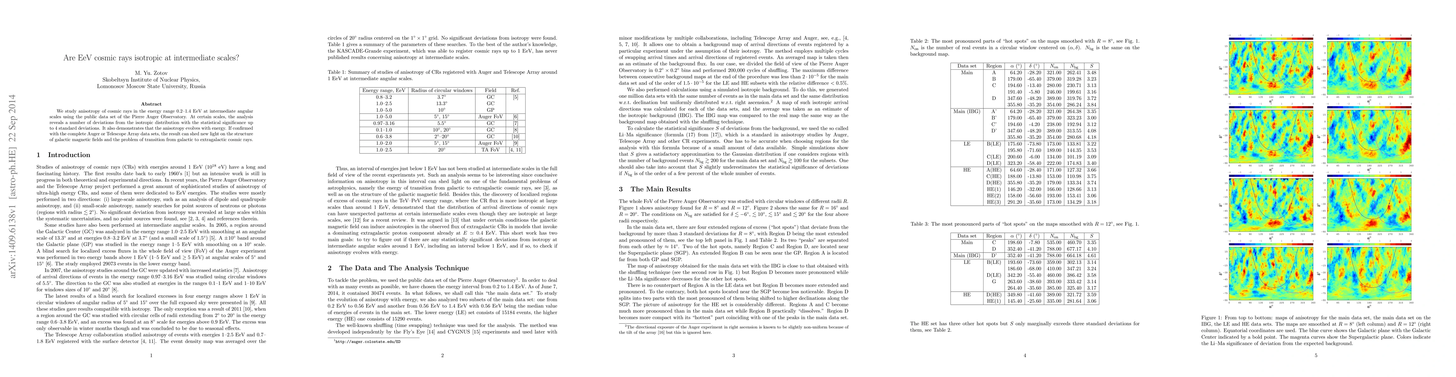 We study anisotropy of cosmic rays in the energy range 0.2-1.4 EeV at intermediate angular scales using the public data set of the Pierre Auger Observatory. At certain scales, the analysis reveals a number of deviations from the isotropic distribution with the statistical significance above three standard deviations. It also demonstrates that the anisotropy evolves with energy. If confirmed with the complete Auger or Telescope Array data sets, the result can shed new light on the structure of galactic magnetic fields and the problem of transition from galactic to extragalactic cosmic rays.