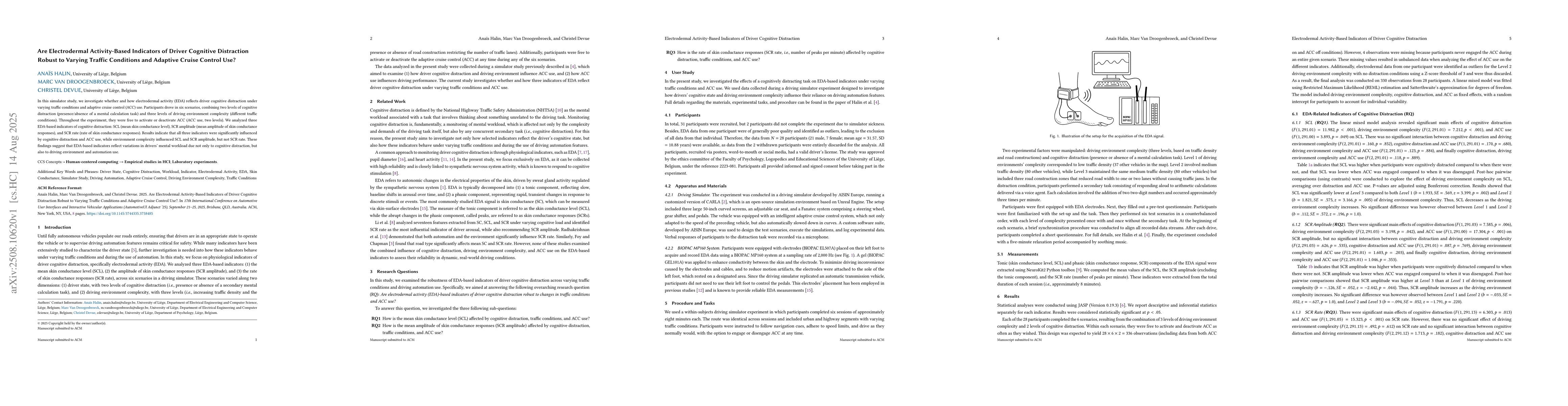 In this simulator study, we investigate whether and how electrodermal activity (EDA) reflects driver cognitive distraction under varying traffic conditions and adaptive cruise control (ACC) use. Participants drove in six scenarios, combining two levels of cognitive distraction (presence/absence of a mental calculation task) and three levels of driving environment complexity (different traffic conditions). Throughout the experiment, they were free to activate or deactivate ACC (ACC use, two levels). We analyzed three EDA-based indicators of cognitive distraction: SCL (mean skin conductance level), SCR amplitude (mean amplitude of skin conductance responses), and SCR rate (rate of skin conductance responses). Results indicate that all three indicators were significantly influenced by cognitive distraction and ACC use, while environment complexity influenced SCL and SCR amplitude, but not SCR rate. These findings suggest that EDA-based indicators reflect variations in drivers' mental workload due not only to cognitive distraction, but also to driving environment and automation use.