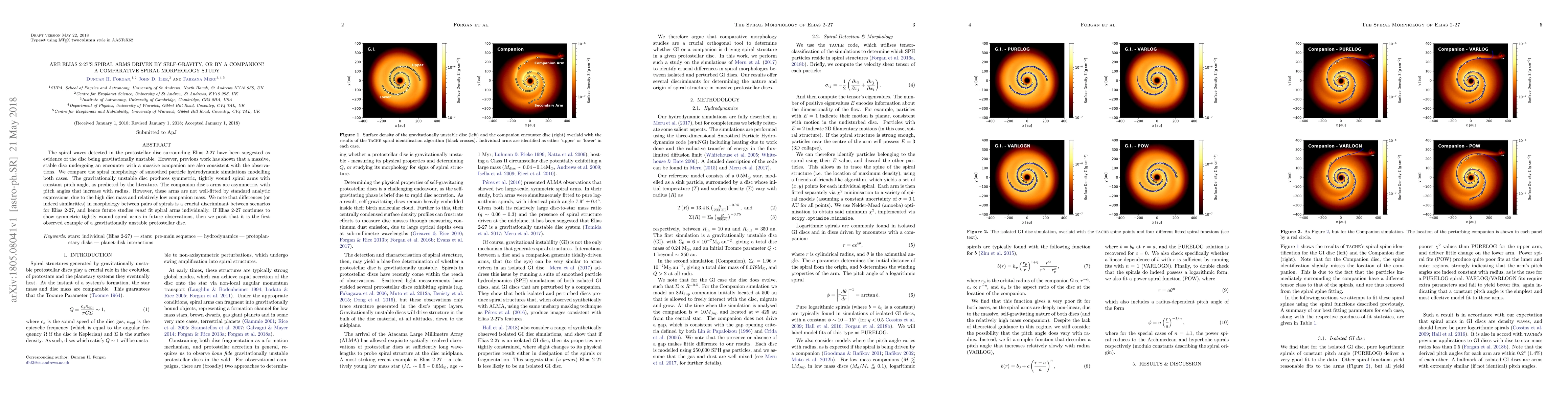 This study compares the spiral morphology in the protostellar disc of Elias 2-27 to determine whether it is driven by self-gravity or a companion star. The findings suggest that while gravitationally unstable discs produce symmetric spiral arms, those from companion encounters are asymmetric and do not fit standard models.