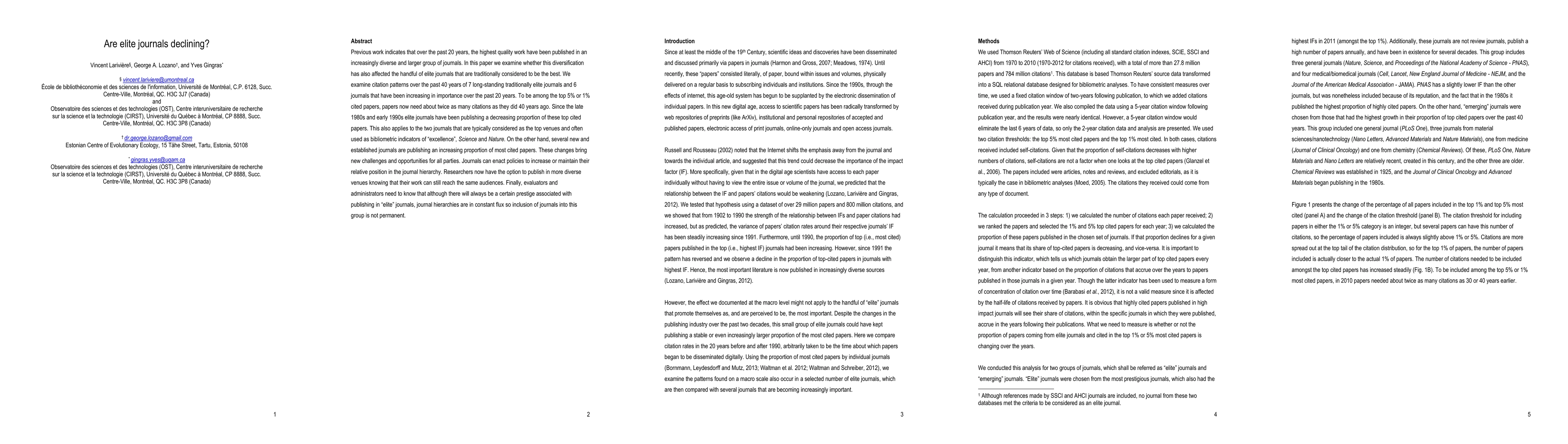 This paper investigates whether elite journals are declining in their dominance by examining citation patterns over 40 years. It finds that elite journals are publishing a decreasing proportion of top-cited papers, while newer and established journals are gaining prominence, indicating a shift in the publication landscape.