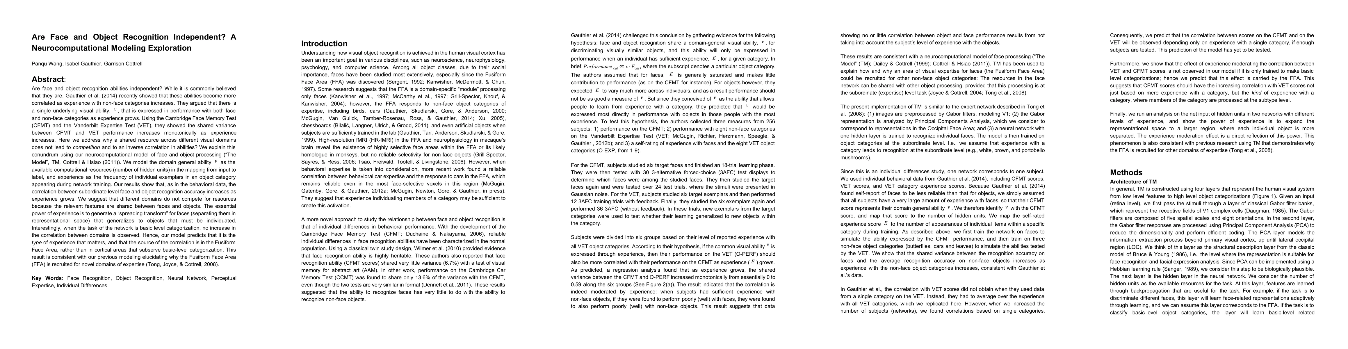 This paper explores whether face and object recognition abilities are independent, proposing that increased experience with nonface categories enhances the correlation between these abilities. The authors use a neurocomputational model to demonstrate that shared features across domains prevent competition, suggesting that the fusiform face area, rather than basic level categorization areas, is the source of this correlation.