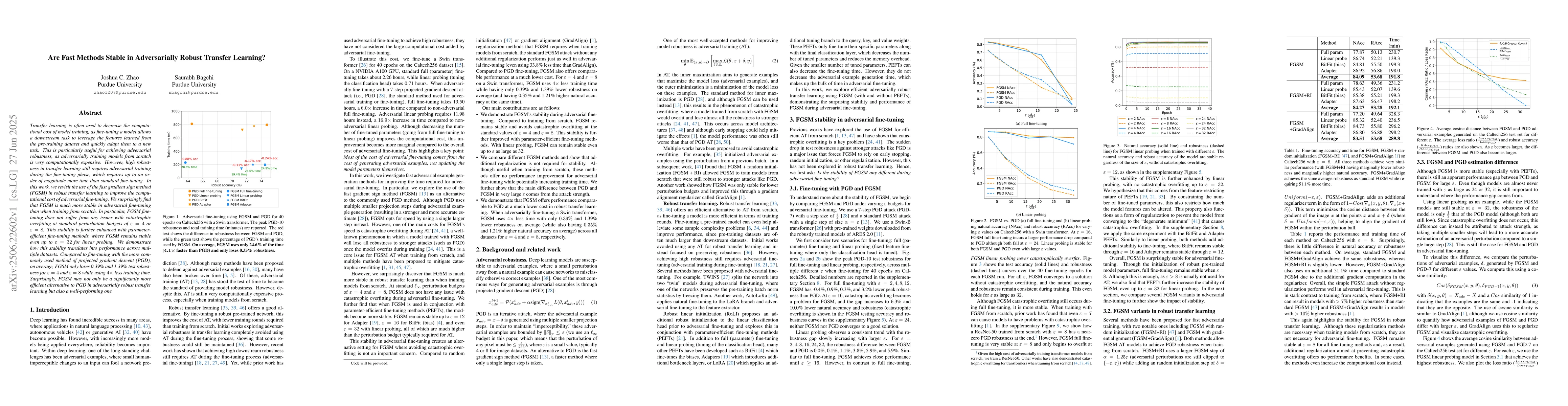 Transfer learning is often used to decrease the computational cost of model training, as fine-tuning a model allows a downstream task to leverage the features learned from the pre-training dataset and quickly adapt them to a new task. This is particularly useful for achieving adversarial robustness, as adversarially training models from scratch is very computationally expensive. However, high robustness in transfer learning still requires adversarial training during the fine-tuning phase, which requires up to an order of magnitude more time than standard fine-tuning. In this work, we revisit the use of the fast gradient sign method (FGSM) in robust transfer learning to improve the computational cost of adversarial fine-tuning. We surprisingly find that FGSM is much more stable in adversarial fine-tuning than when training from scratch. In particular, FGSM fine-tuning does not suffer from any issues with catastrophic overfitting at standard perturbation budgets of $\varepsilon=4$ or $\varepsilon=8$. This stability is further enhanced with parameter-efficient fine-tuning methods, where FGSM remains stable even up to $\varepsilon=32$ for linear probing. We demonstrate how this stability translates into performance across multiple datasets. Compared to fine-tuning with the more commonly used method of projected gradient descent (PGD), on average, FGSM only loses 0.39% and 1.39% test robustness for $\varepsilon=4$ and $\varepsilon=8$ while using $4\times$ less training time. Surprisingly, FGSM may not only be a significantly more efficient alternative to PGD in adversarially robust transfer learning but also a well-performing one.