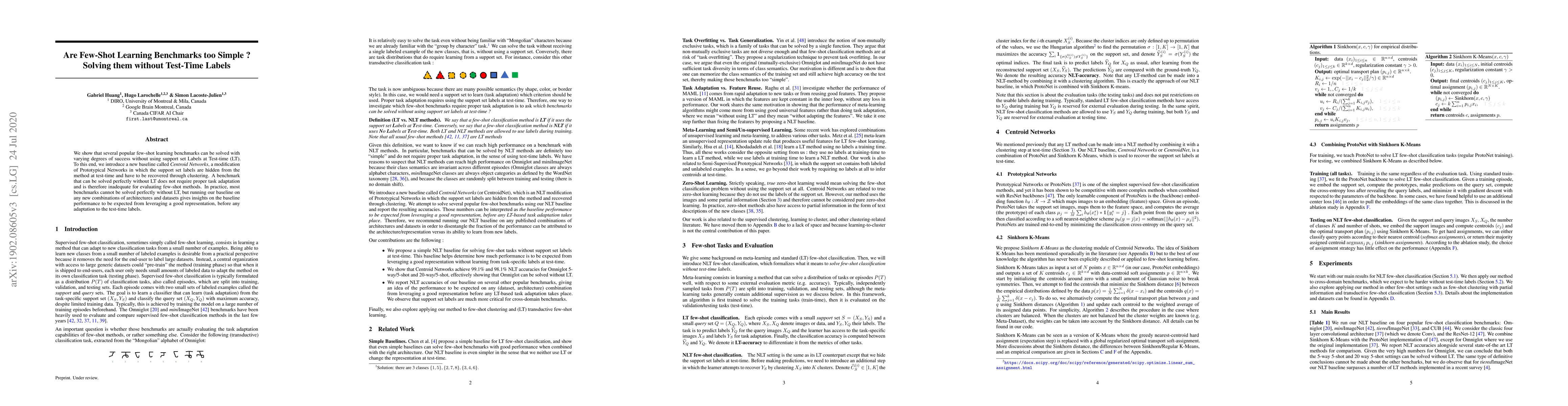 This paper demonstrates that several popular few-shot learning benchmarks can be solved without test-time label supervision, introducing a new Centroid Networks baseline that recovers labels through clustering. The study concludes that benchmarks that can be solved perfectly without label supervision are inadequate for evaluating few-shot learning methods.