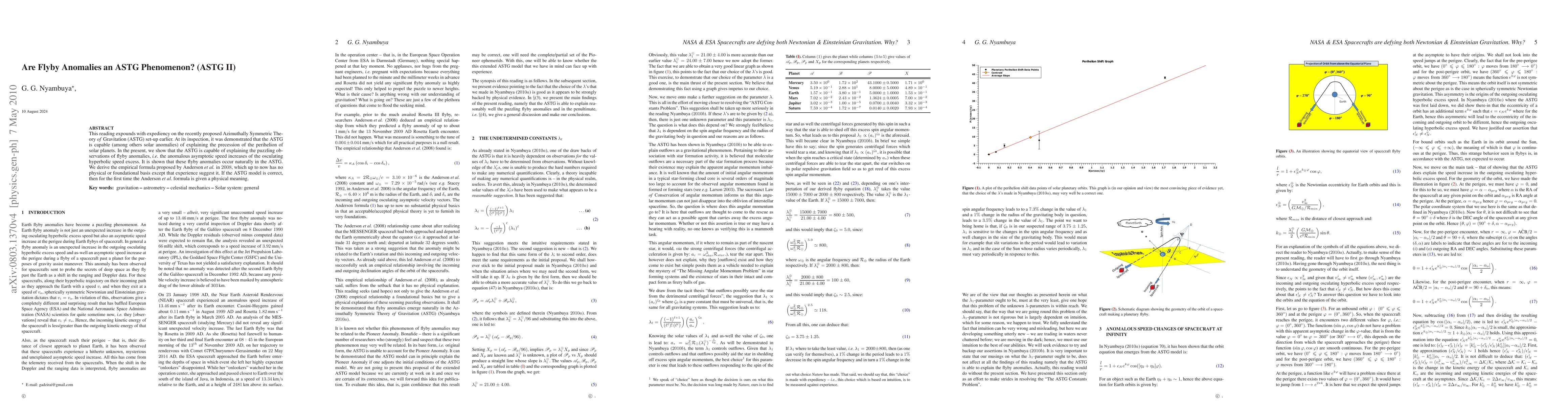 This reading expounds with expediency on the recently proposed Azimuthally Symmetric Theory of Gravitation (ASTG) set-up earlier. At its inspection, it was demonstrated that the ASTG is capable (among others solar anomalies) of explaining the precession of the perihelion of solar planets. In the present, we show that the ASTG is capable of explaining the puzzling observations of flyby anomalies, i.e. the anomalous asymptotic speed increases of the osculating hyperbolic speed excess. It is shown that these flyby anomalies occur naturally in the ASTG. We derive the empirical formula proposed by Anderson et al. in 2008, which up to now has no physical or foundational basis except that experience suggest it. If the ASTG model is correct, then for the first time the Anderson et al. formula is given a physical meaning.