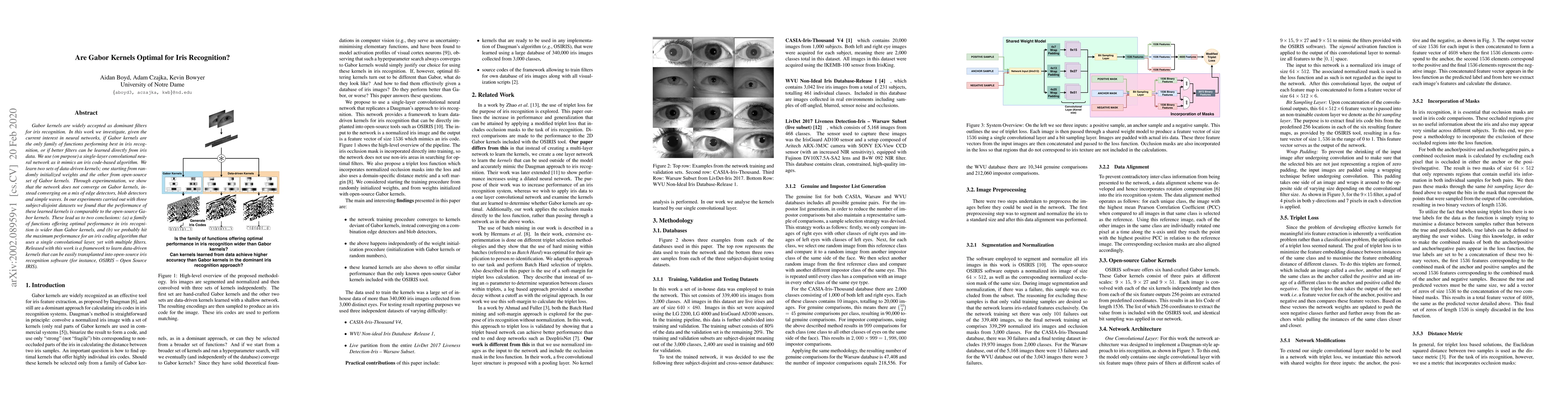 This research investigates whether Gabor kernels remain optimal for iris recognition, exploring if neural networks can learn better filters. Experiments show that learned kernels, unlike Gabor kernels, converge on a mix of edge, blob detectors, and simple waves, achieving comparable performance. The study concludes that optimal functions for iris recognition extend beyond Gabor kernels.