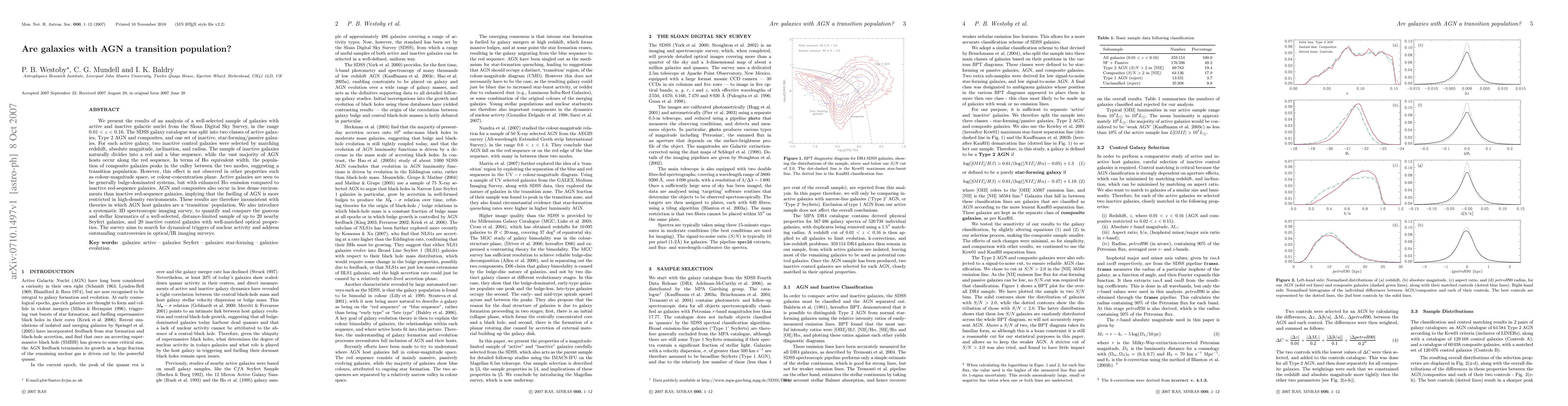 We present the results of an analysis of a well-selected sample of galaxies with active and inactive galactic nuclei from the Sloan Digital Sky Survey, in the range 0.01 < z < 0.16. The SDSS galaxy catalogue was split into two classes of active galaxies, Type~2 AGN and composites, and one set of inactive, star-forming/passive galaxies. For each active galaxy, two inactive control galaxies were selected by matching redshift, absolute magnitude, inclination, and radius. The sample of inactive galaxies naturally divides into a red and a blue sequence, while the vast majority of AGN hosts occur along the red sequence. In terms of H-alpha equivalent width, the population of composite galaxies peaks in the valley between the two modes, suggesting a transition population. However, this effect is not observed in other properties such as colour-magnitude space, or colour-concentration plane. Active galaxies are seen to be generally bulge-dominated systems, but with enhanced H-alpha emission compared to inactive red-sequence galaxies. AGN and composites also occur in less dense environments than inactive red-sequence galaxies, implying that the fuelling of AGN is more restricted in high-density environments. These results are therefore inconsistent with theories in which AGN host galaxies are a `transition' population. We also introduce a systematic 3D spectroscopic imaging survey, to quantify and compare the gaseous and stellar kinematics of a well-selected, distance-limited sample of up to 20 nearby Seyfert galaxies, and 20 inactive control galaxies with well-matched optical properties. The survey aims to search for dynamical triggers of nuclear activity and address outstanding controversies in optical/IR imaging surveys.