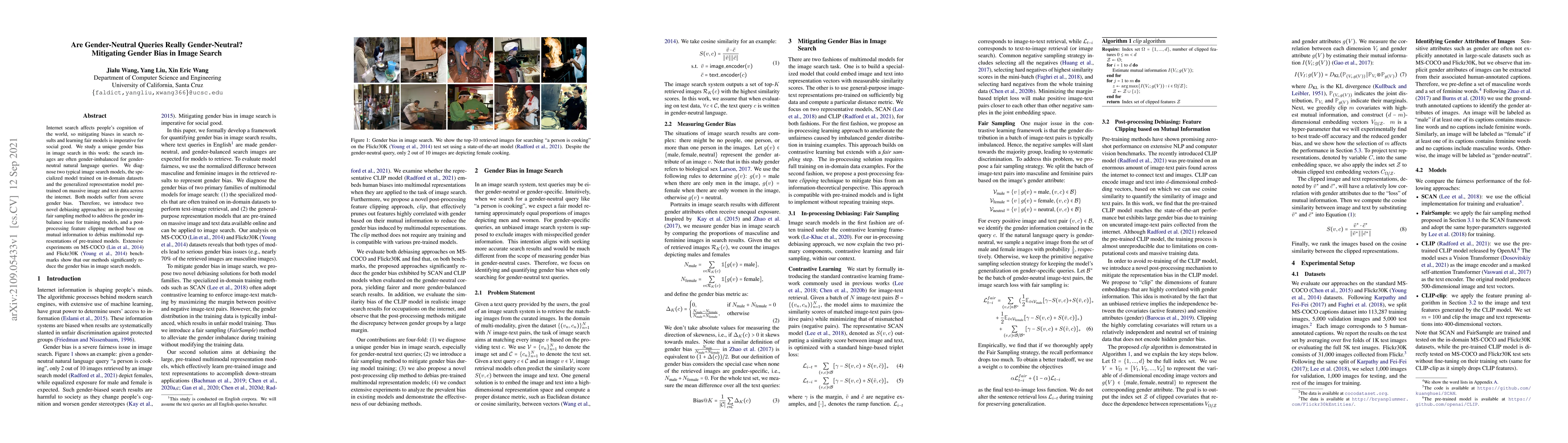 This paper investigates gender bias in gender-neutral image search queries, finding that both specialized and generalized search models exhibit severe gender imbalance. To mitigate this, the authors propose two debiasing methods: an in-processing fair sampling technique and a post-processing feature clipping method, which significantly reduce gender bias in image search models, as demonstrated by experiments on MS-COCO and Flickr30K datasets.