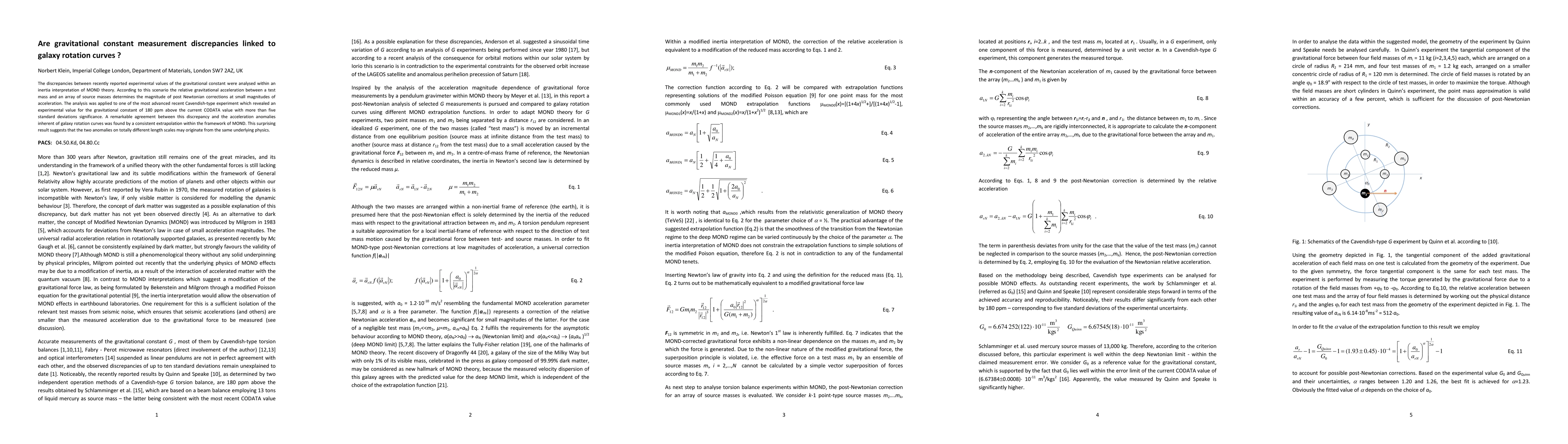 The discrepancies between recently reported experimental values of the gravitational constant were analysed within an inertia interpretation of MOND theory. According to this scenario the relative gravitational acceleration between a test mass and an array of source masses determines the magnitude of post Newtonian corrections at small magnitudes of acceleration. The analysis was applied to one of the most advanced recent Cavendish-type experiment which revealed an experimental value for the gravitational constant of 180 ppm above the current CODATA value with more than five standard deviations significance. A remarkable agreement between this discrepancy and the acceleration anomalies inherent of galaxy rotation curves was found by a consistent extrapolation within the framework of MOND. This surprising result suggests that the two anomalies on totally different length scales may originate from the same underlying physics.