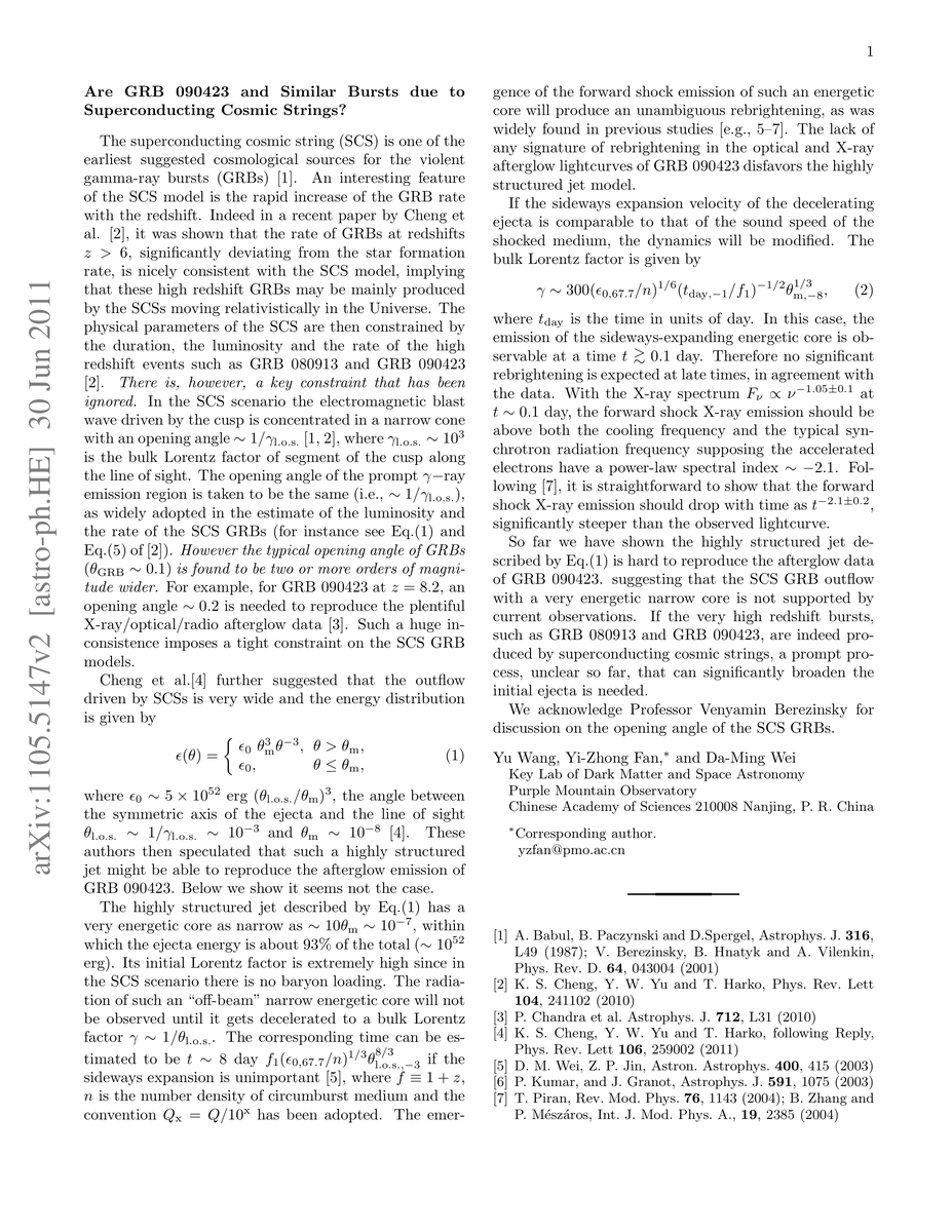 Superconducting cosmic strings may be able to power energetic gamma-ray bursts, in particular at high-redshifts ($z>6$). The ultra-relativistic outflows driven by the superconducting cosmic strings, however, seem too narrow to be consistent with the afterglow data of GRB 090423 and GRB 080913.