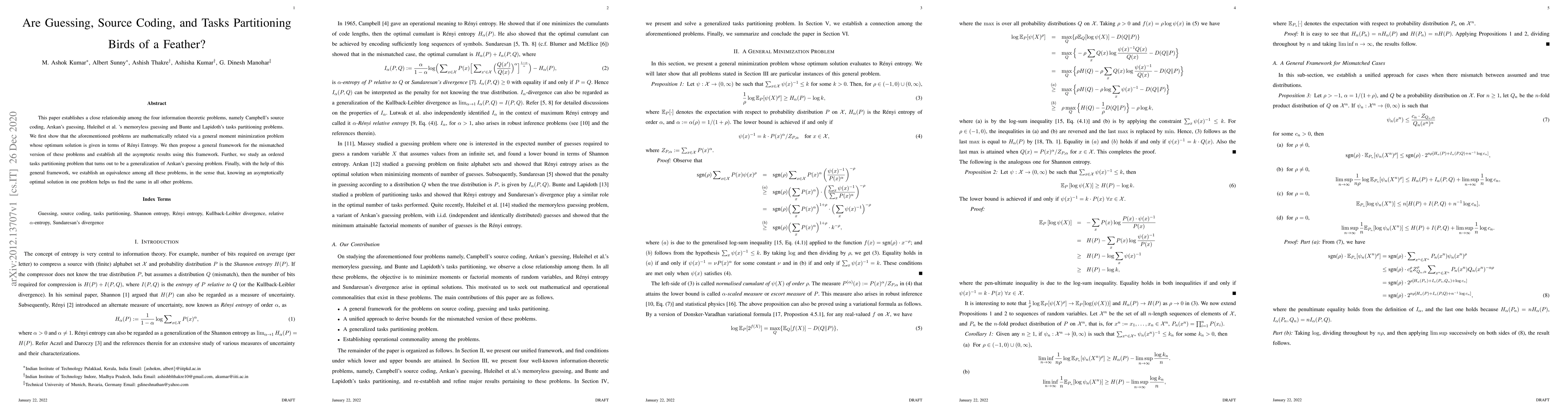 This paper establishes a close relationship among the four information theoretic problems, namely Campbell source coding, Arikan guessing, Huleihel et al. memoryless guessing and Bunte and Lapidoth tasks partitioning problems. We first show that the aforementioned problems are mathematically related via a general moment minimization problem whose optimum solution is given in terms of Renyi entropy. We then propose a general framework for the mismatched version of these problems and establish all the asymptotic results using this framework. Further, we study an ordered tasks partitioning problem that turns out to be a generalisation of Arikan's guessing problem. Finally, with the help of this general framework, we establish an equivalence among all these problems, in the sense that, knowing an asymptotically optimal solution in one problem helps us find the same in all other problems.