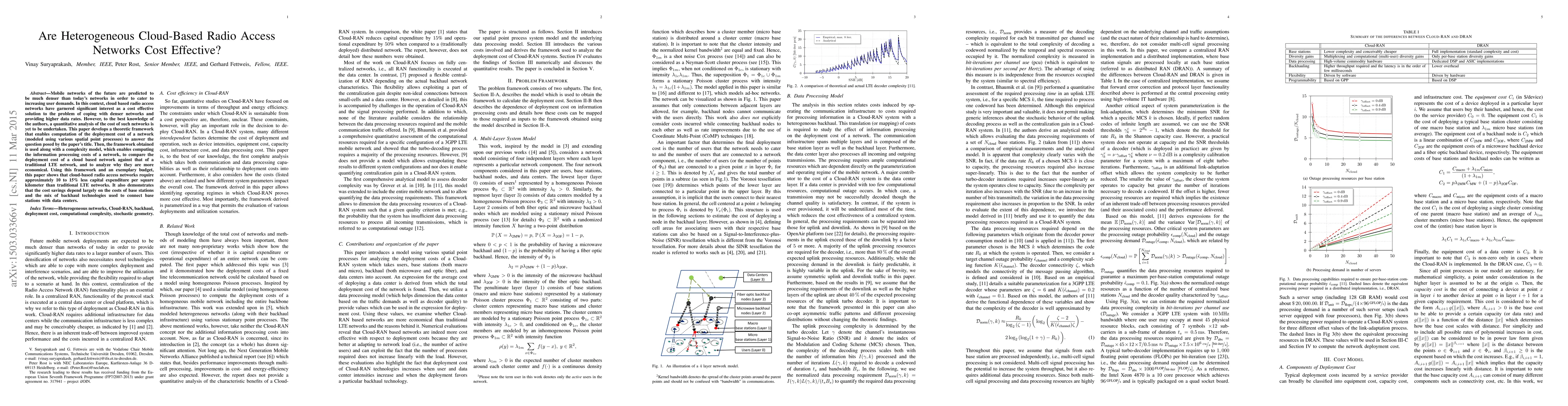 This paper develops a theoretical framework to compute the deployment cost of cloud-based radio access networks, comparing it to traditional LTE networks. It finds that cloud-based networks require 10-15% less capital expenditure per square kilometer, with cost savings largely dependent on base station costs and backhaul technologies.