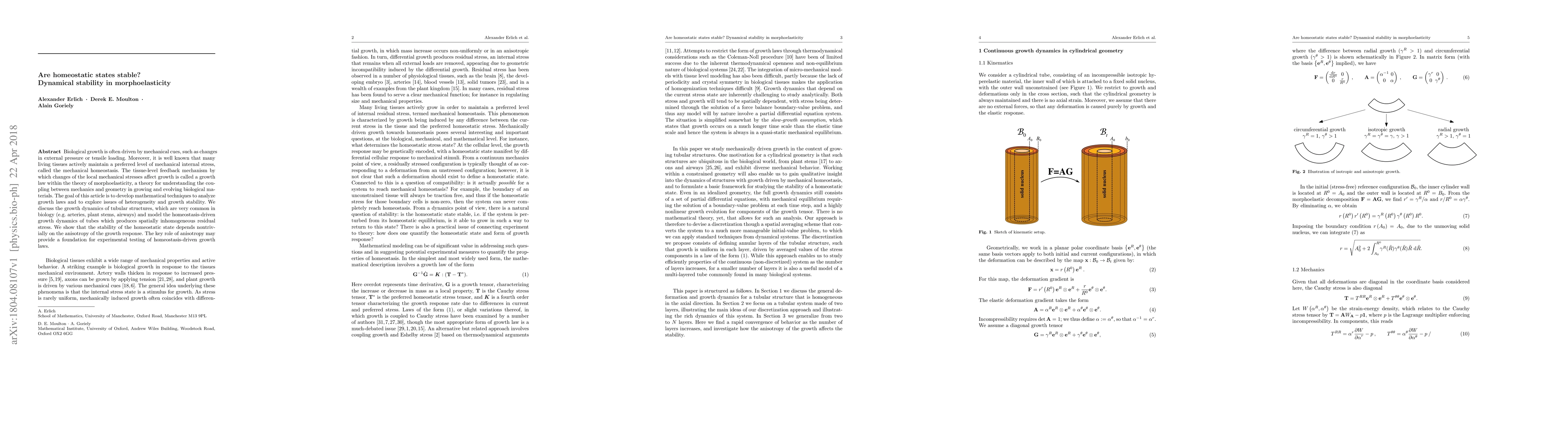 This paper explores the stability of mechanical homeostasis in biological tissues through morphoelasticity, focusing on tubular structures like arteries and plant stems. It develops mathematical techniques to analyze growth laws and demonstrates that the stability of homeostatic states is significantly influenced by the anisotropy of the growth response, providing a basis for experimental validation.