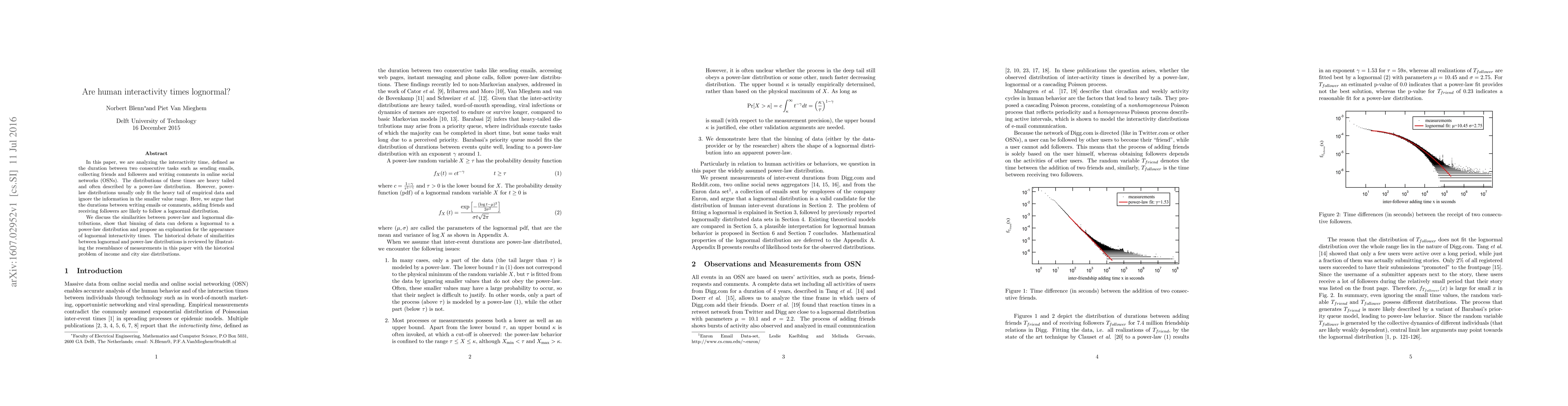 This paper investigates whether human interactivity times in online social networks follow a lognormal distribution rather than a power-law distribution, arguing that lognormal distributions better capture the full range of observed durations. It discusses the transformation of lognormal distributions into power-law-like distributions through data binning and compares these findings to historical debates on income and city size distributions.