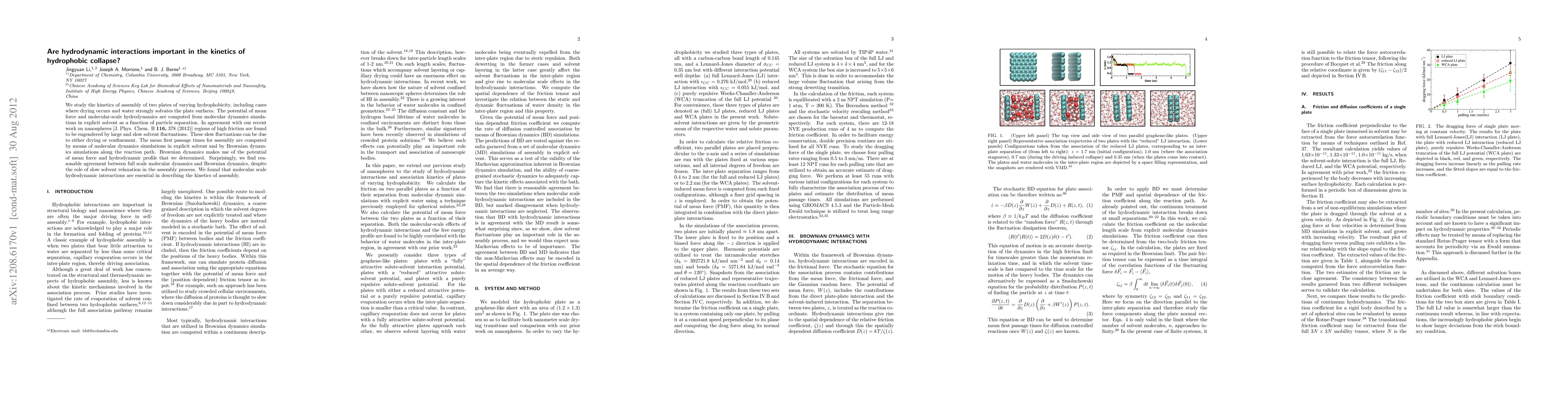 We study the kinetics of assembly of two plates of varying hydrophobicity, including cases where drying occurs and water strongly solvates the plate surfaces. The potential of mean force and molecular-scale hydrodynamics are computed from molecular dynamics simulations in explicit solvent as a function of particle separation. In agreement with our recent work on nanospheres [J. Phys. Chem. B 116, 378 (2012)] regions of high friction are found to be engendered by large and slow solvent fluctuations. These slow fluctuations can be due to either drying or confinement. The mean first passage times for assembly are computed by means of molecular dynamics simulations in explicit solvent and by Brownian dynamics simulations along the reaction path. Brownian dynamics makes use of the potential of mean force and hydrodynamic profile that we determined. Surprisingly, we find reasonable agreement between full scale molecular dynamics and Brownian dynamics, despite the role of slow solvent relaxation in the assembly process. We found that molecular scale hydrodynamic interactions are essential in describing the kinetics of assembly.