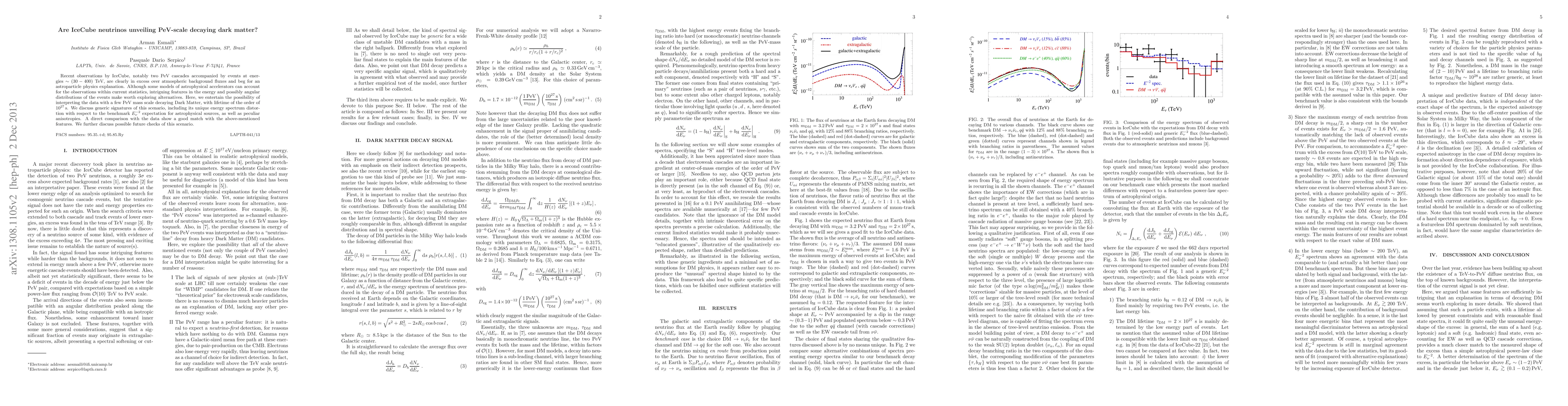 Recent IceCube neutrino observations may suggest a PeV-scale decaying dark matter model, with unique energy spectra and anisotropies that match the data.