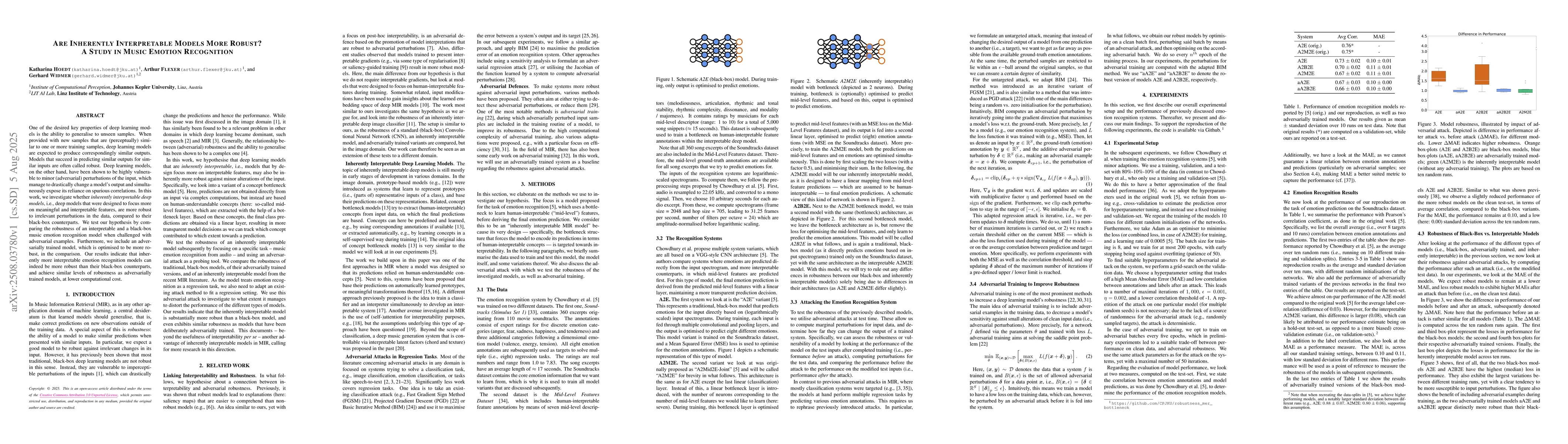 One of the desired key properties of deep learning models is the ability to generalise to unseen samples. When provided with new samples that are (perceptually) similar to one or more training samples, deep learning models are expected to produce correspondingly similar outputs. Models that succeed in predicting similar outputs for similar inputs are often called robust. Deep learning models, on the other hand, have been shown to be highly vulnerable to minor (adversarial) perturbations of the input, which manage to drastically change a model's output and simultaneously expose its reliance on spurious correlations. In this work, we investigate whether inherently interpretable deep models, i.e., deep models that were designed to focus more on meaningful and interpretable features, are more robust to irrelevant perturbations in the data, compared to their black-box counterparts. We test our hypothesis by comparing the robustness of an interpretable and a black-box music emotion recognition (MER) model when challenged with adversarial examples. Furthermore, we include an adversarially trained model, which is optimised to be more robust, in the comparison. Our results indicate that inherently more interpretable models can indeed be more robust than their black-box counterparts, and achieve similar levels of robustness as adversarially trained models, at lower computational cost.