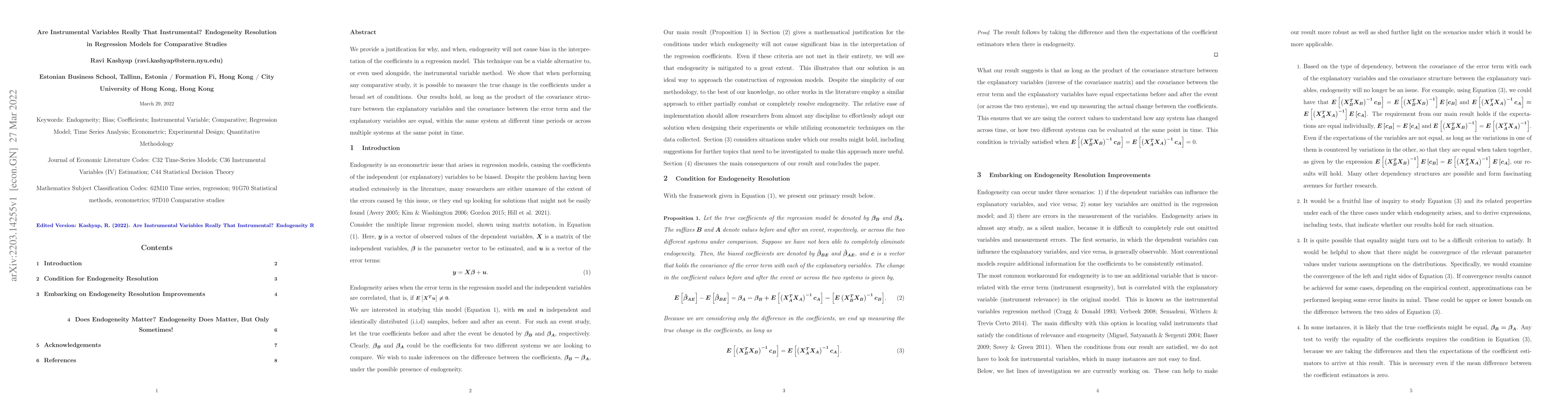We provide a justification for why, and when, endogeneity will not cause bias in the interpretation of the coefficients in a regression model. This technique can be a viable alternative to, or even used alongside, the instrumental variable method. We show that when performing any comparative study, it is possible to measure the true change in the coefficients under a broad set of conditions. Our results hold, as long as the product of the covariance structure between the explanatory variables and the covariance between the error term and the explanatory variables are equal, within the same system at different time periods or across multiple systems at the same point in time.