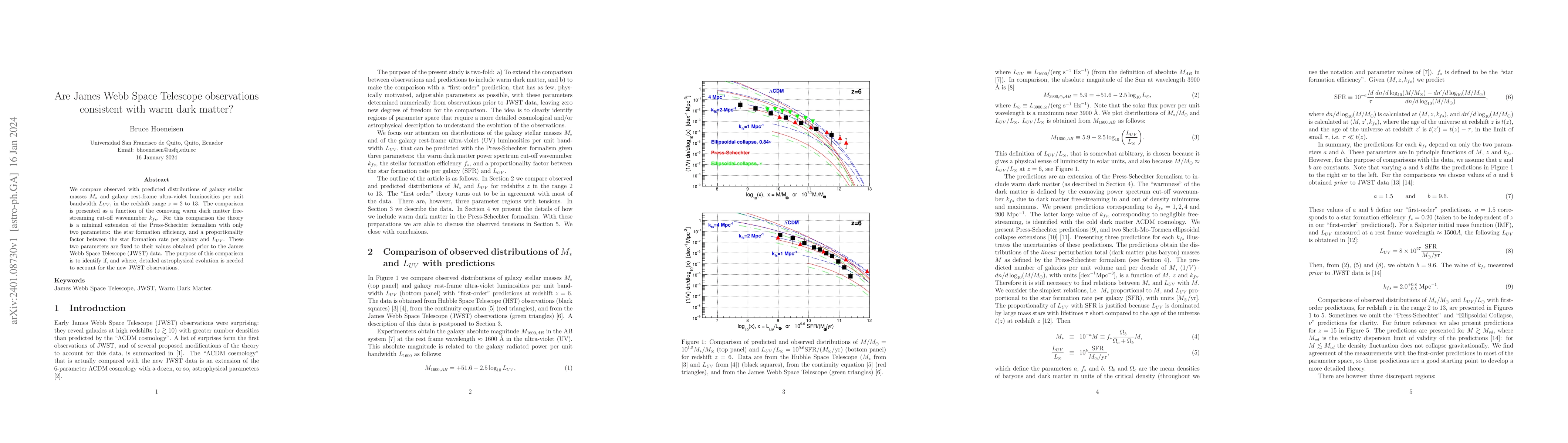 We compare observed with predicted distributions of galaxy stellar masses $M_*$ and galaxy rest-frame ultra-violet luminosities per unit bandwidth $L_{UV}$, in the redshift range $z = 2$ to 13. The comparison is presented as a function of the comoving warm dark matter free-streaming cut-off wavenumber $k_{fs}$. For this comparison the theory is a minimal extension of the Press-Schechter formalism with only two parameters: the star formation efficiency, and a proportionality factor between the star formation rate per galaxy and $L_{UV}$. These two parameters are fixed to their values obtained prior to the James Webb Space Telescope (JWST) data. The purpose of this comparison is to identify if, and where, detailed astrophysical evolution is needed to account for the new JWST observations.
