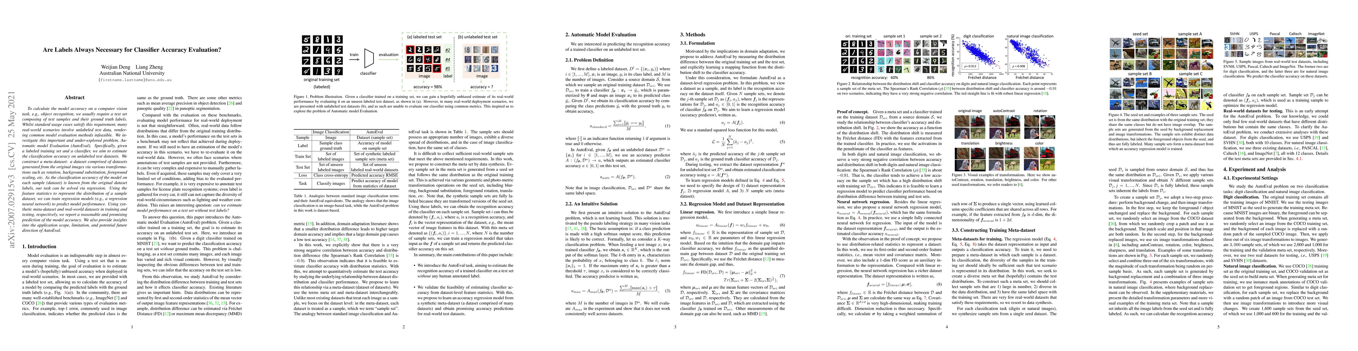 This paper explores Automatic model Evaluation (AutoEval) to estimate classifier accuracy on unlabeled test data, proposing a meta-dataset approach using transformed images and regression models to predict performance. The study demonstrates promising results and discusses the potential and limitations of AutoEval in real-world scenarios.