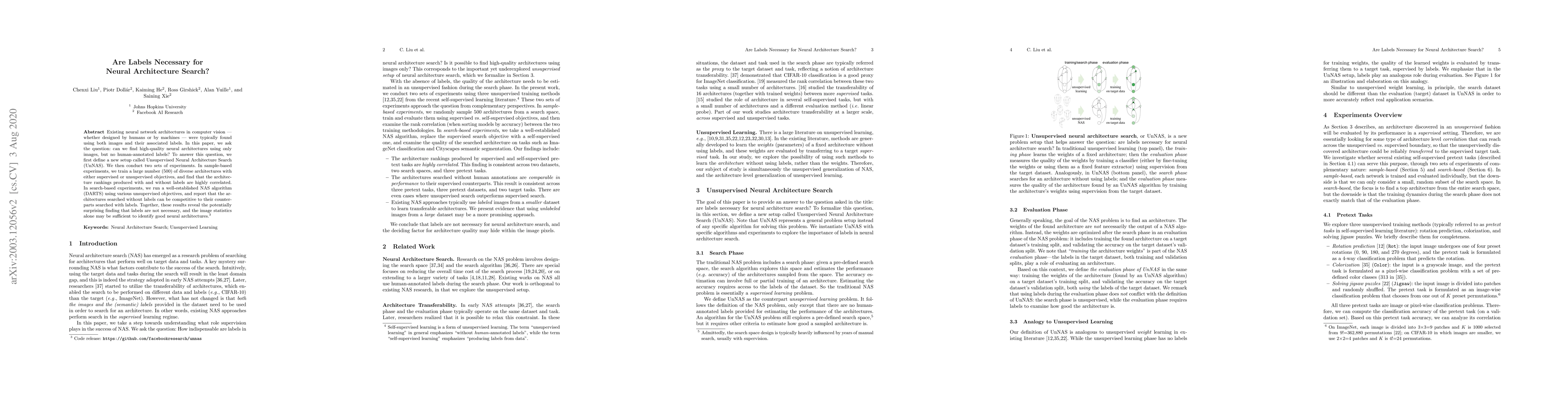 Existing neural network architectures in computer vision -- whether designed by humans or by machines -- were typically found using both images and their associated labels. In this paper, we ask the question: can we find high-quality neural architectures using only images, but no human-annotated labels? To answer this question, we first define a new setup called Unsupervised Neural Architecture Search (UnNAS). We then conduct two sets of experiments. In sample-based experiments, we train a large number (500) of diverse architectures with either supervised or unsupervised objectives, and find that the architecture rankings produced with and without labels are highly correlated. In search-based experiments, we run a well-established NAS algorithm (DARTS) using various unsupervised objectives, and report that the architectures searched without labels can be competitive to their counterparts searched with labels. Together, these results reveal the potentially surprising finding that labels are not necessary, and the image statistics alone may be sufficient to identify good neural architectures.